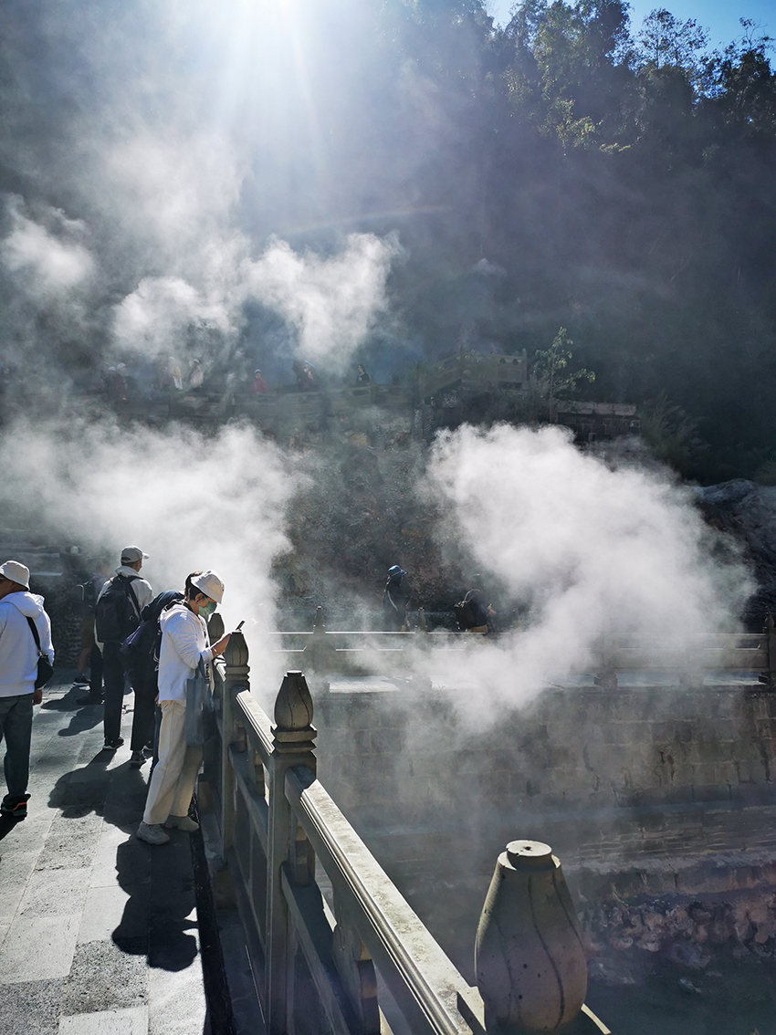 沿着雾气氤氲的栈道前行,热气将视野染得朦胧,鼓鸣泉如战擂,珍珠泉似玉碎,蛤蟆嘴不住嘶鸣。