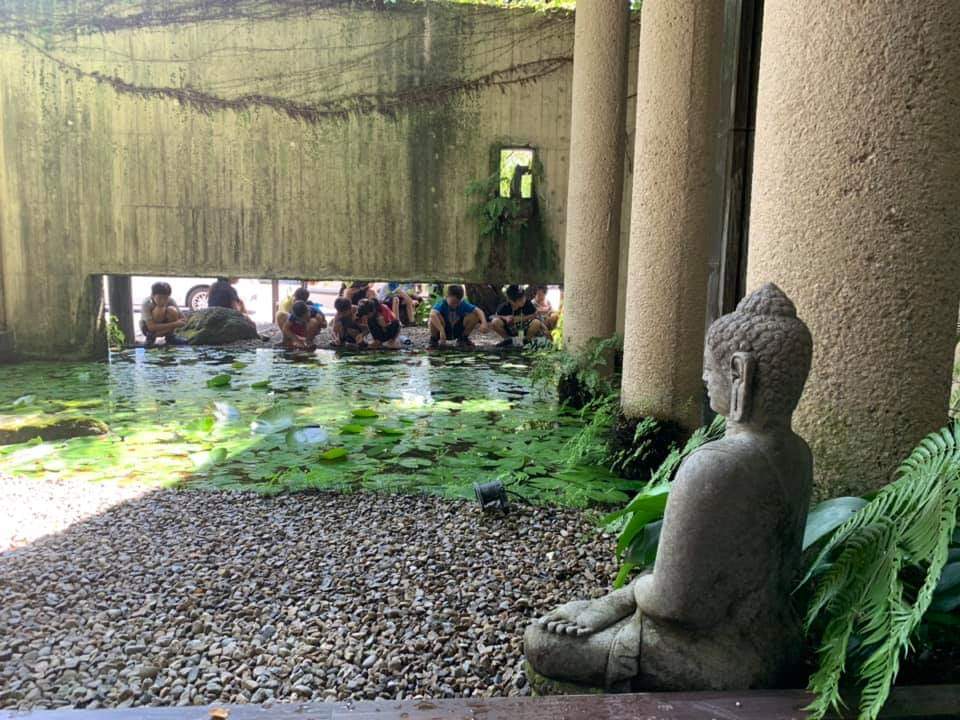 正在参究,想要寻求答案之时,忽然听见身后传来潺潺水声的呼唤,那不是雨落下的声音,那是ㄧ片清净的水瀑,沿着长满蕨类的墙,落进水池的咚咚声响。水的声音如此悦耳动人,令人想要回头探望,把头一转,就在那瞬间出离红尘的回望,映入眼帘的是一大片绿幽幽的水墙,不及地面的伫立在水池的中央,让一半的水池显露在外,而另一半的水池隐藏在内,如同此岸(烦恼)和彼岸(清净)。它看似被分隔,却是无二分界,因为只要悟道,就能悟出烦恼即菩提的道理。