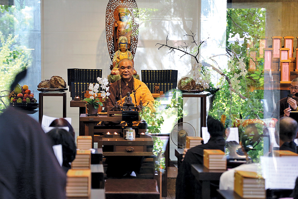 置身大殿,不论是聆听法师开示佛法,抑或是让身心沉浸在法会的经唱,还是安坐修禅,那一面透亮的落地窗仿佛在提醒我们勿忘大殿以外的有情众生,而应当时刻忆念苍生。