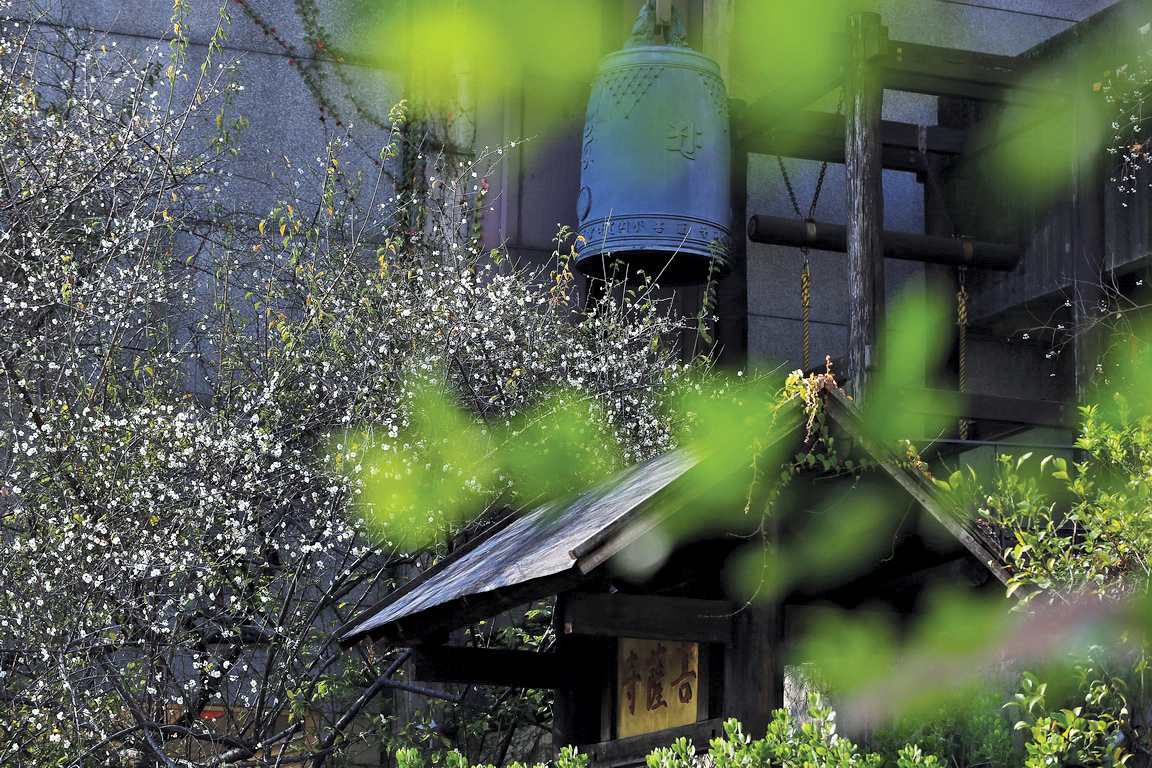 冬天的来临,褪去了春夏的绿和秋天的红,老梅树光秃秃的枝桠上长满朵朵白色的梅花,楚楚动人,却又散发着一种坚毅的美,犹如歌颂菩萨精进勇敢的精神。冬天的菩萨寺是赤裸的,只见粗糙的清水模,泛着暗淡灰白的冰冷。