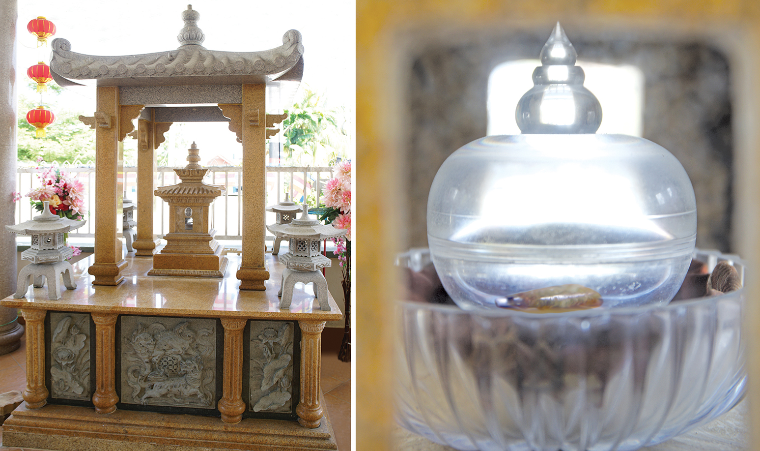 一座高9尺,宽6尺,外观稳重浑厚,由塔基、塔身、塔刹组成,外型揉合了各宗各派舍利塔的设计,包括密宗、日本式等造型设计的镜公舍利塔,可说是马来西亚第一座纯手工雕刻打造的舍利塔。