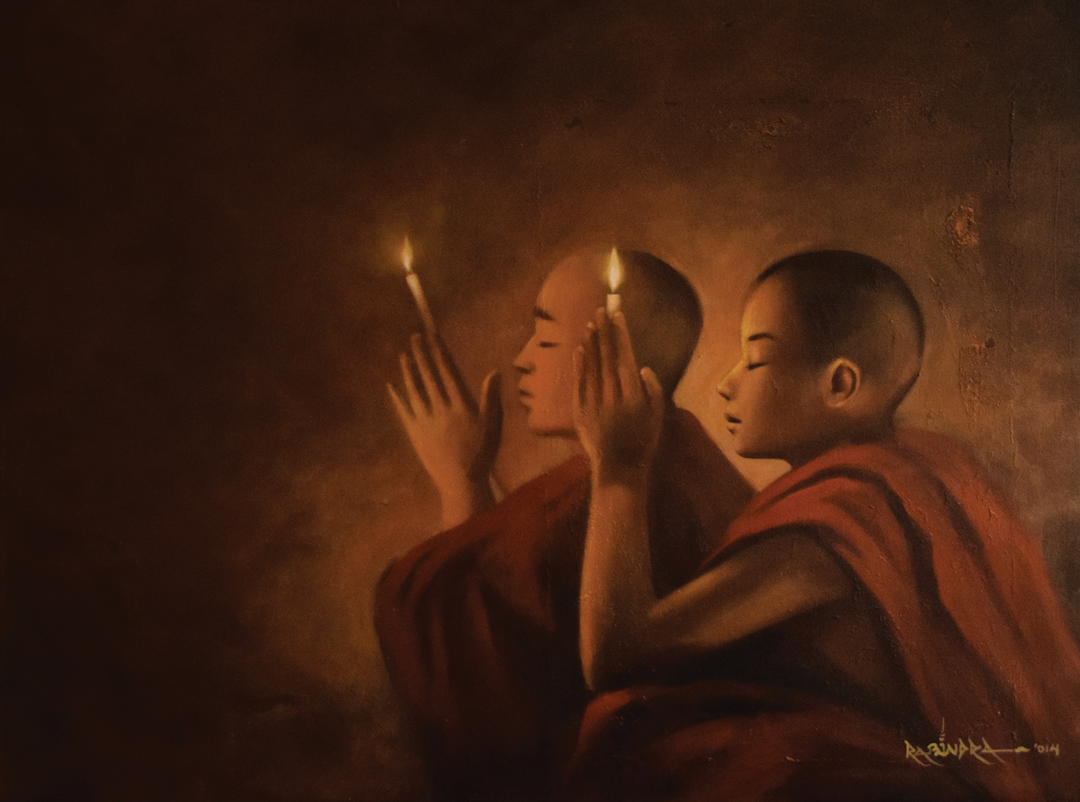他在画里描绘的慈祥有爱的容颜,划出天际而照亮心间的万丈光芒,弱小动物的被爱与呵护,僧人智者和他手里的书或经典,那神圣的山川大地,那宁静的寺庙……再再的引领着我们去寻回自己和生命的真,寻回与生具来的良善和智慧,那才是最终的涅盘或天堂。