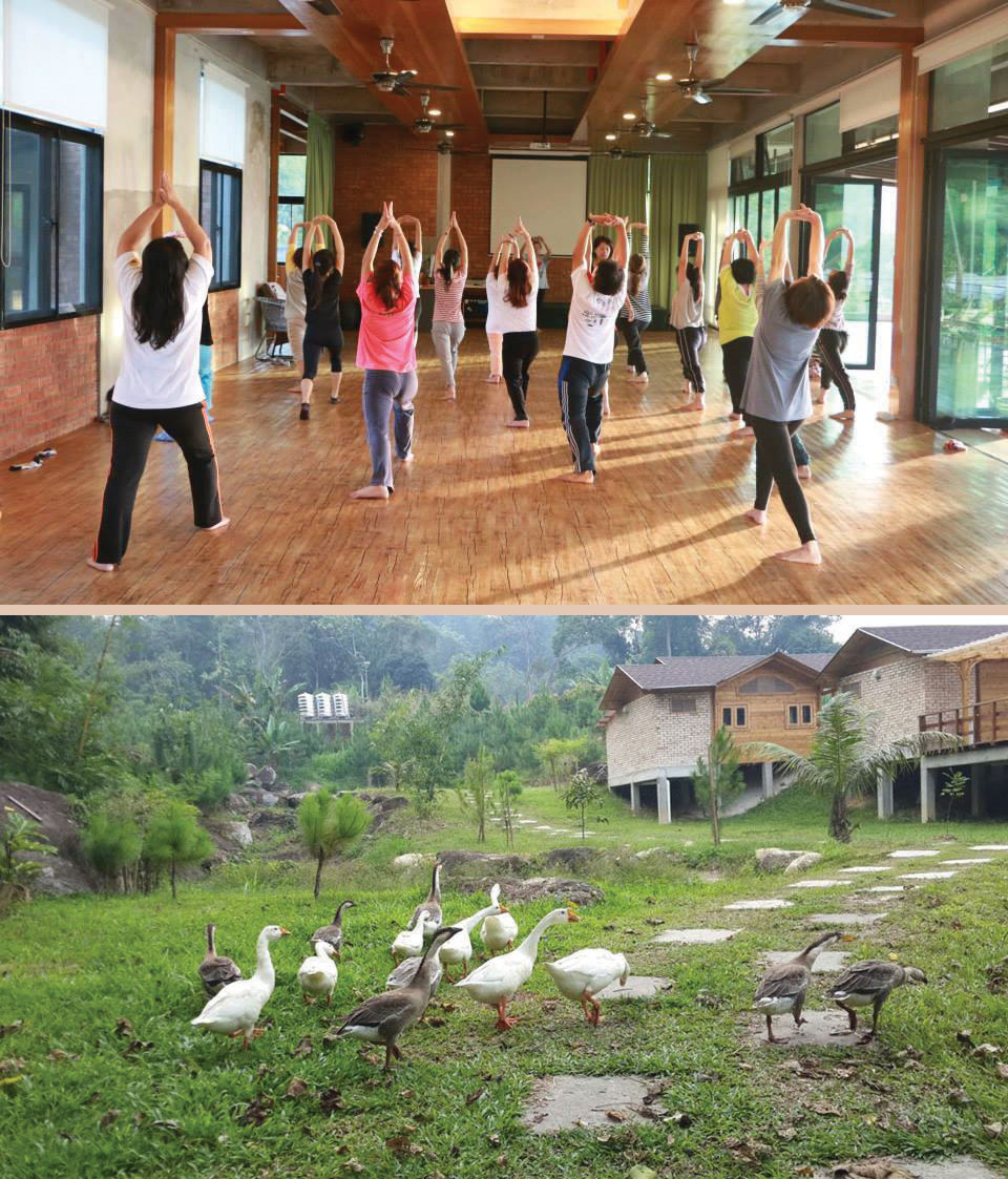 接下来的两天早晨,由于下着绵绵细雨,我们惟有在二楼讲堂外有遮蔽的空间做瑜珈。清爽的空气夹带着微微的寒意,遇上瑜珈后身体的温热,却是另一种自然舒适的感觉。这里餐饮既健康又营养,如五谷杂粮粥、有机番薯,生机沙拉配自制调味酱,还有自家种植的新鲜蔬菜,道道色香味俱全,为大家好好补充了上课期时所消耗的能量。此外,餐厅的柜台上全天候备有香茅水或青草茶,供大家随时饮用。