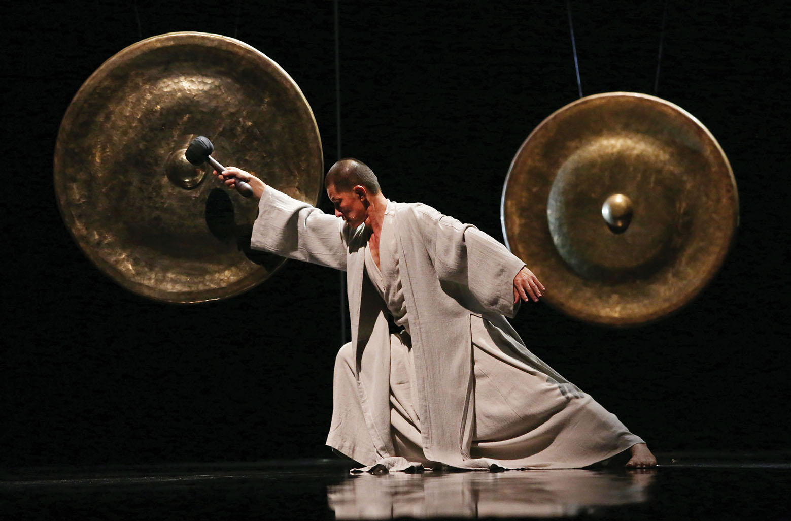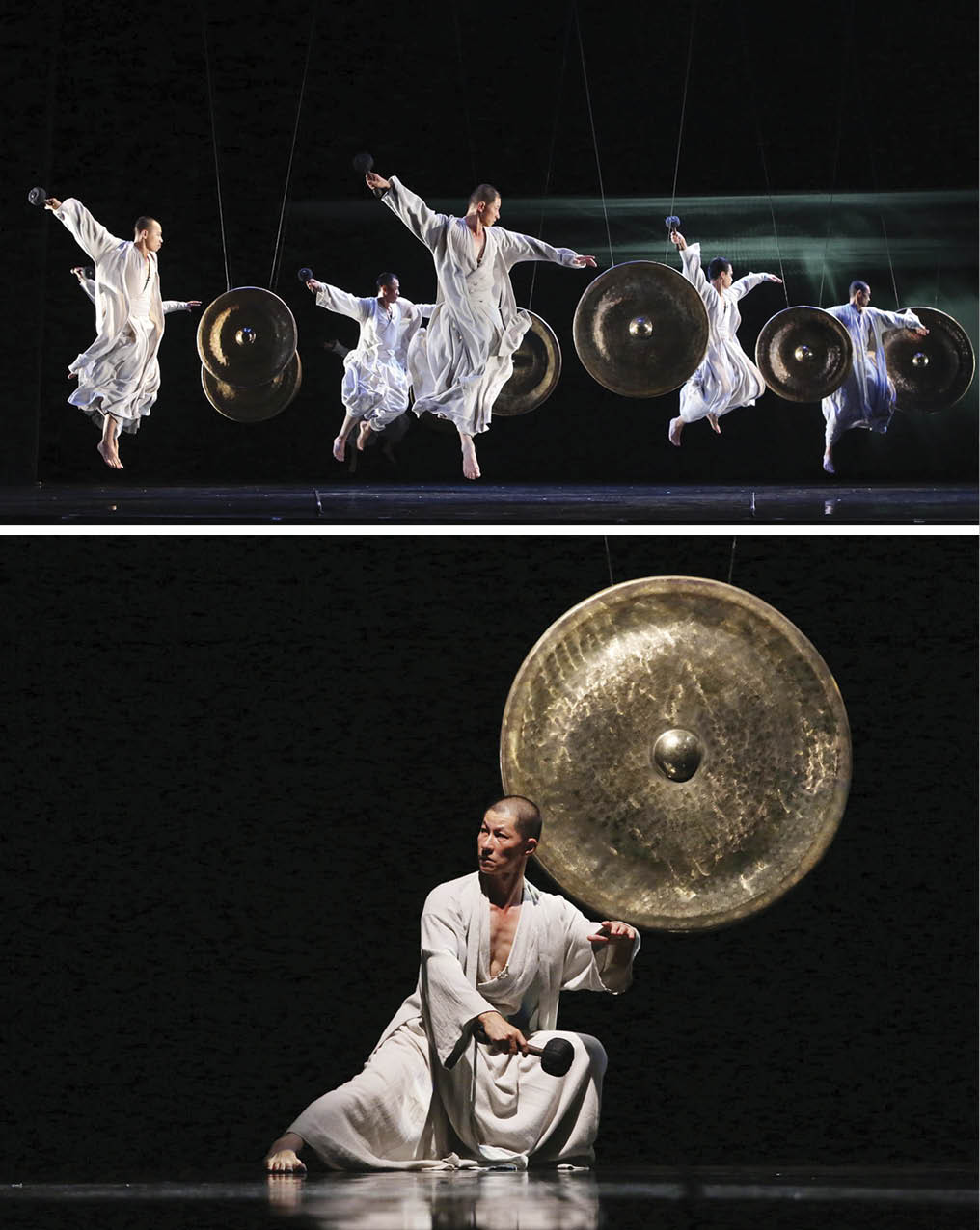 大大小小的铜锣,从天而降,以美丽的舞动姿态,敲击最高音和极低音的铜锣。