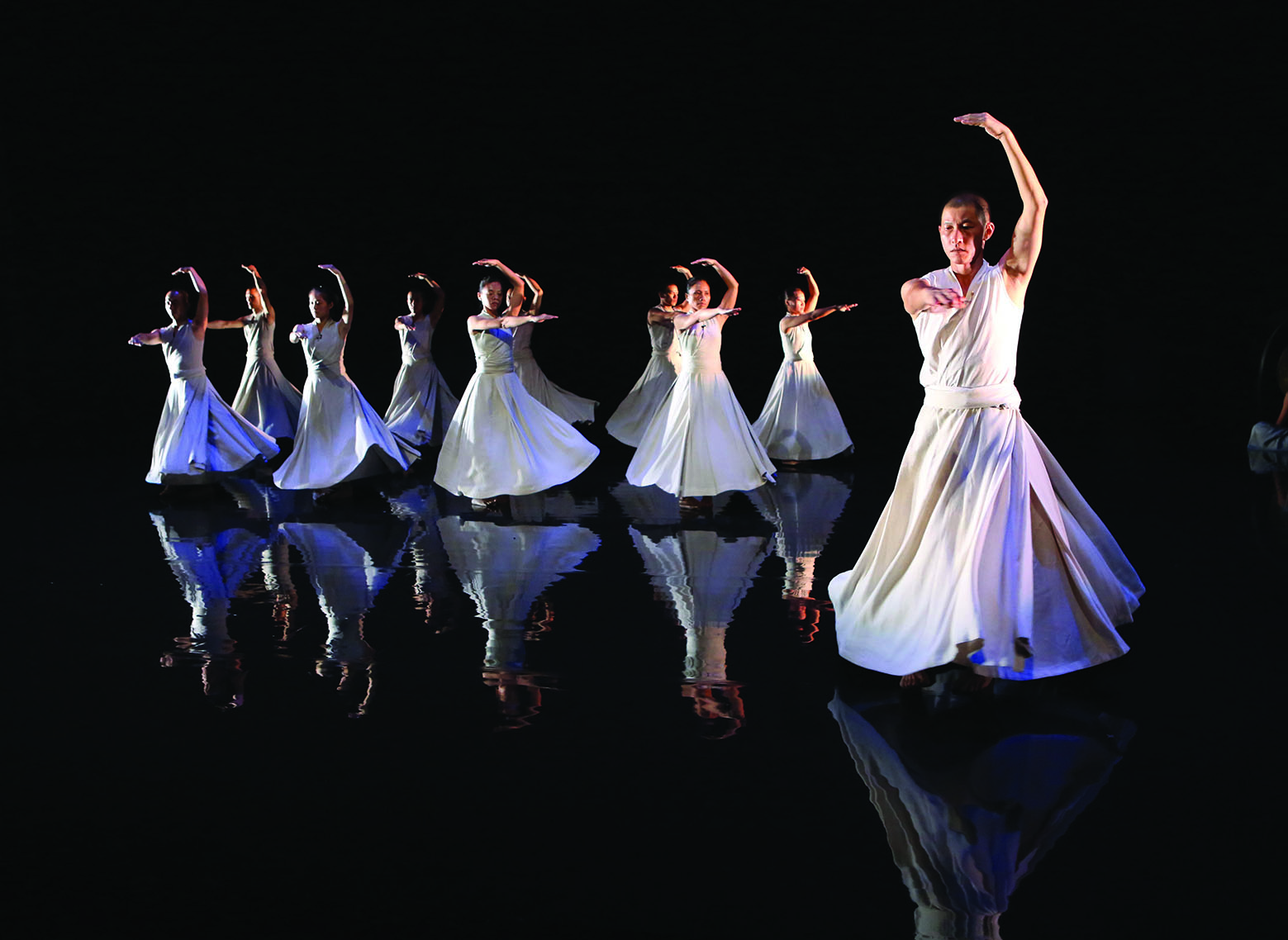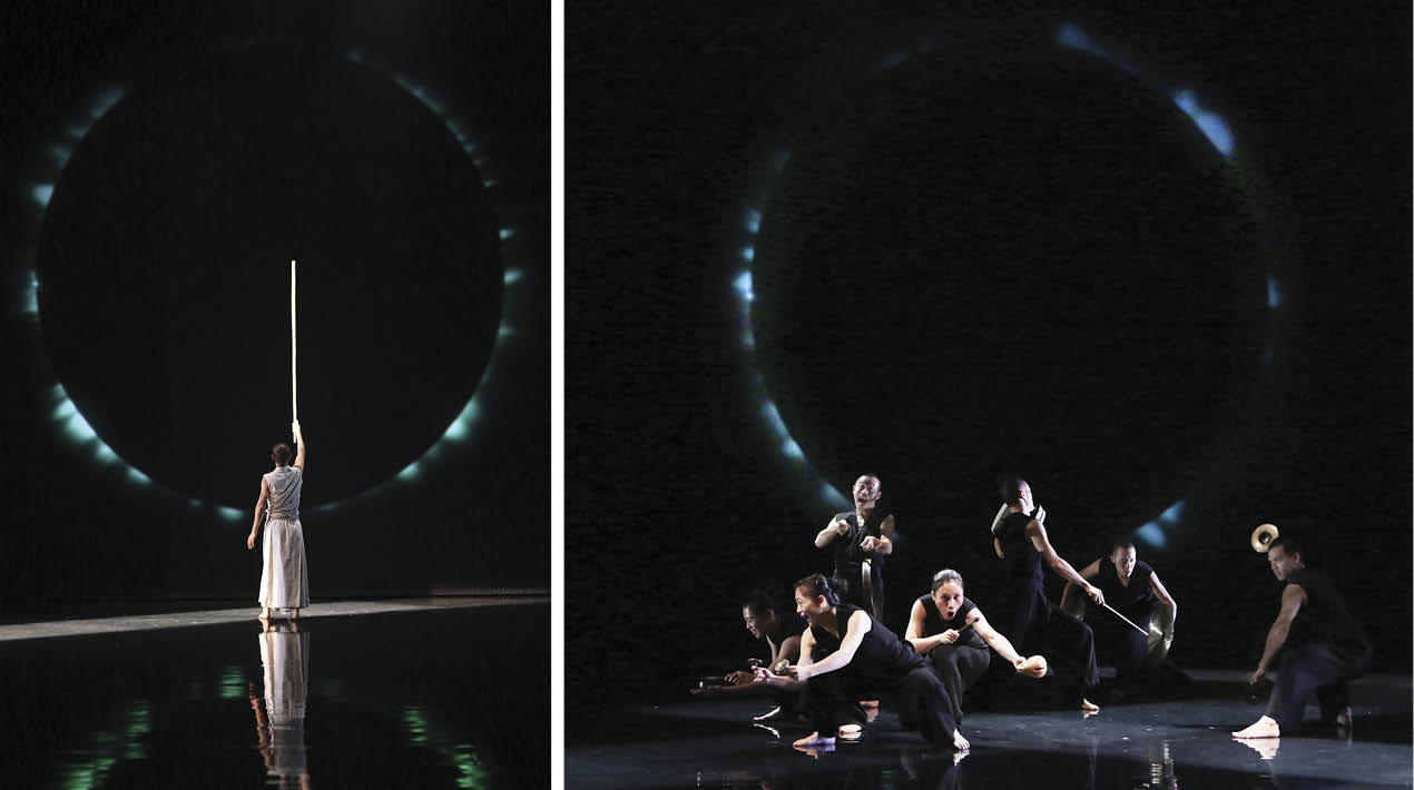 在时间之外里有好几个画面和段落都非常经典。其中有一幕用了大大小小的铜锣,从天而降,以美丽的舞动姿态,敲击最高音和极低音的铜锣,那种最清亮和极低沉音声的交结和击撞,能将人带入时间之外,进入一种未知的境界,是一种超越文字所能描述的觉受和体验,让观众进入浑然的状态,如痴如醉!