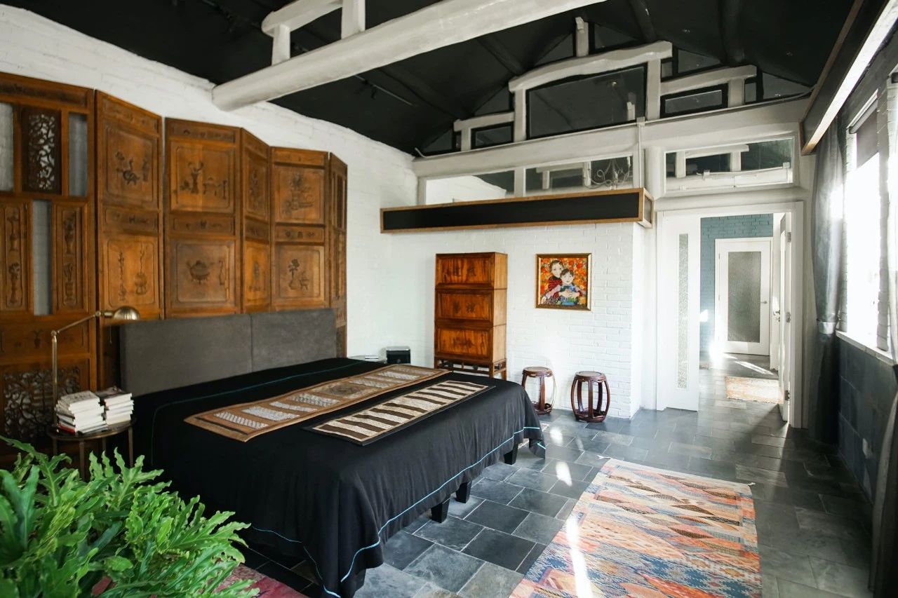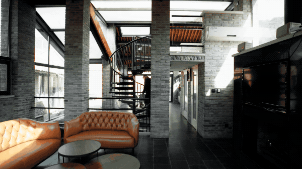 新建房子的南边是胡同,考虑到私密性和采光,萨洋只在比较靠近房檐的位置,开了一整排的高窗,下午阳光照射进来,也比较柔和。