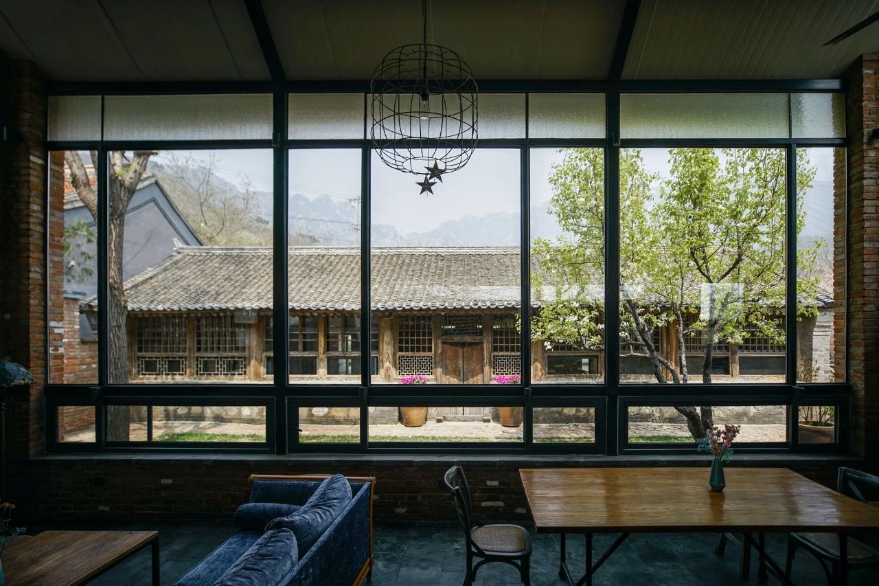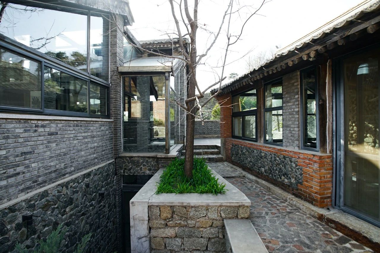 因为高差不同,室外设计了一个曲线型的斜坡。站在百年的老板栗树下,可以眺望到长城上唯一的一处正关台,是很别致的景观。