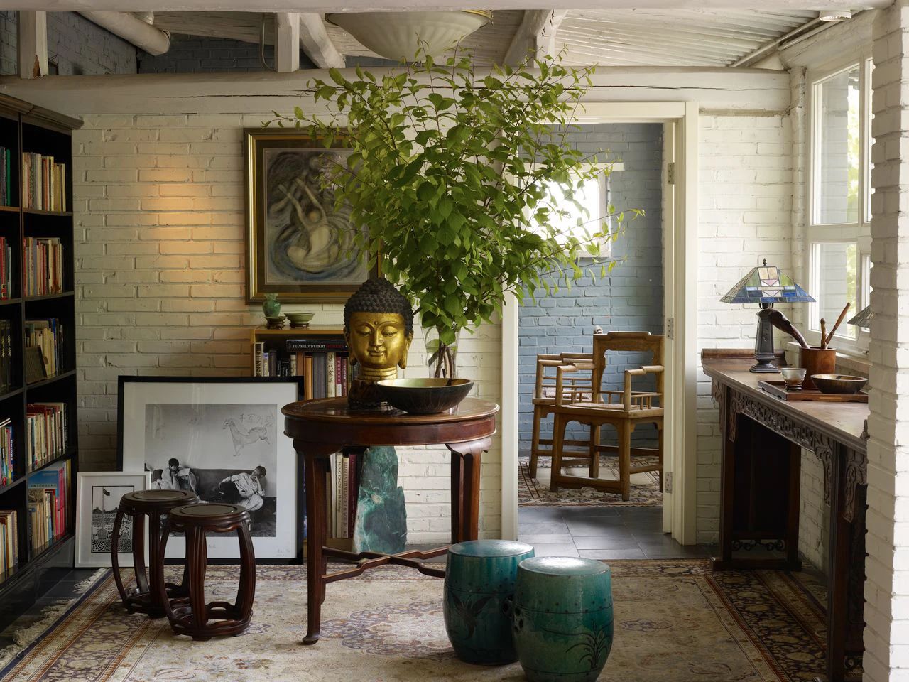 推开大门,正对着的是一整面由破碎的蓝色琉璃瓦拼凑成的墙面,相当于一个传统的影壁墙。转身便豁然开朗,能看到室外花园和最前面一排灰瓦的老房。门前只有三个台阶,另一侧设有一个斜坡,专门留给轮椅使用,这是萨洋为了养老生活所做的准备。萨洋希望自己一直到死都能生活在这里,所以在设计房子的时候,考虑到了很多老了之后的使用需求,比如尽量减少台阶、独处的空间比较宽大、所有的地方都能使用轮椅、甚至可以坐轮椅淋浴……
