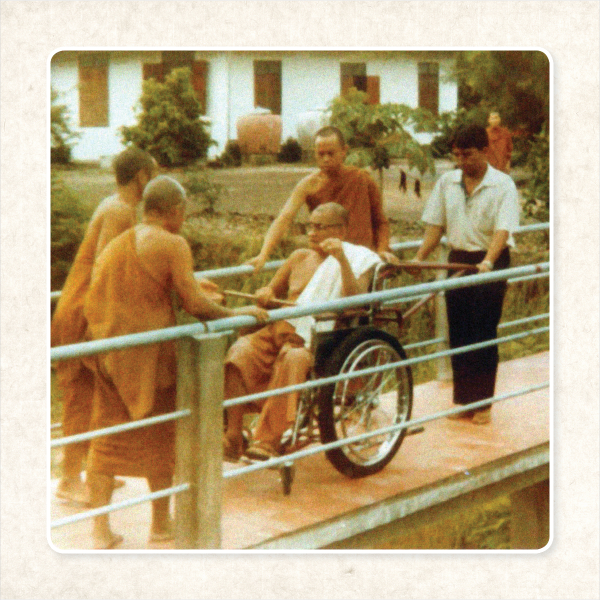 即使在重病时刻,隆波也丝毫不在意病情。他不时拿出他的疾病来提醒弟子关于色身的实相。在金刚光明洞寺时,他常常谈道:“色身就好像是一块大冰一般,它本来由水凝结而成,把它放在外面,一下子它就融化变回水。我们的色身也是这样子衰退。无始以来就是如此......我们打从出生那一天开始,就带着病、老和死一起。在哪儿都无法把它们丢弃。”