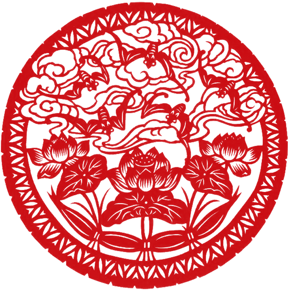 剪纸由满天祥云瑞气、,华茂叶盛的莲藕和五只欢祥其中的蝙蝠组图,“莲”与“连”谐音、“蝠”与“福”谐音,象征老天连连降幅,普天吉祥之兆。