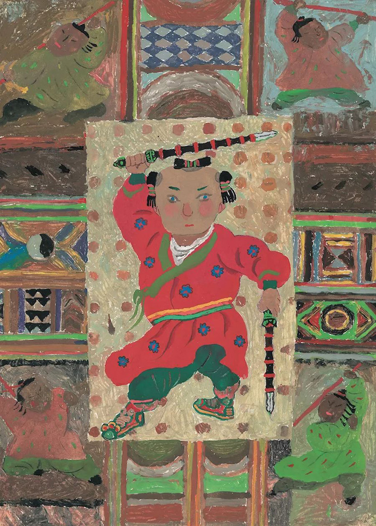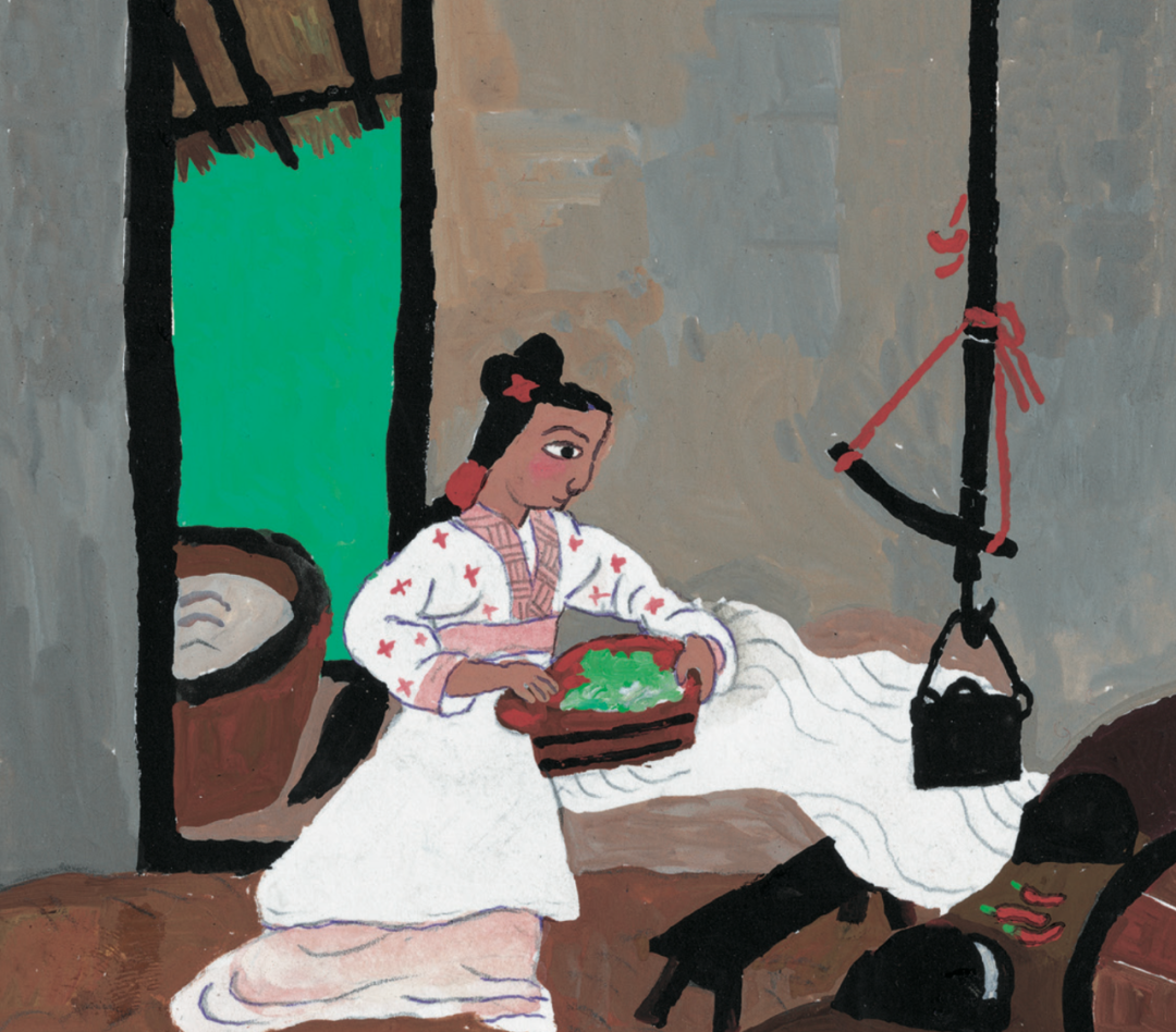 蔡皋的作品大多与民间故事有关,她通过丰富艳丽、夸张变形等手法为这些故事注入了鲜活蓬勃的生命力,民间文化滋养了她的童年,如今她通过画笔反哺于它。