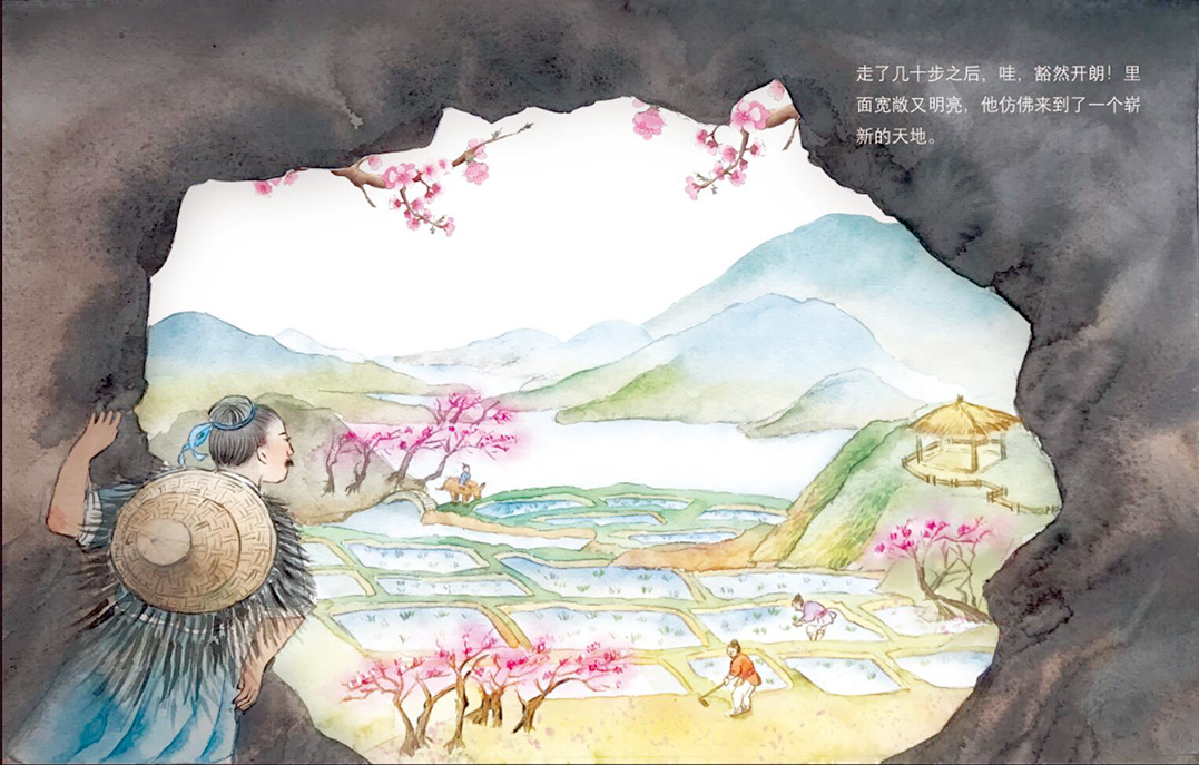 蔡皋:渔人的现实生活中,很窘迫。但是,当他看到美好的东西,看到桃花,他就进入审美的诗的生活,被美所吸引,这就是一种超脱,对现实生活的超越。我觉得,在现实生活中,也要有这种超越的精神。我所有的作品,其实都是要画这种超越精神。这种超越,并不是抽象的、惊天动地的那种大超越,而是对平常生活、庸常生活的小超越。生活中哪有那么多的惊天动地啊。我们都要从寻常事情做起,调动我们的审美超越能动性。渔人就被调动了。在绘本《桃花源的故事》中,我画的雾气蒸腾,一片迷蒙,天水相接。就是想表达,一种很丰沛磅礴的精神。渔人遇到一个“初极狭,才通人”的洞,没有因为害怕而放弃探索。进入真理,中间必然要走一段窄路。生活中,我们每个人都会有一段幽暗不明的时期,要经过窄门,才能豁然开朗,走进光明的一片天。