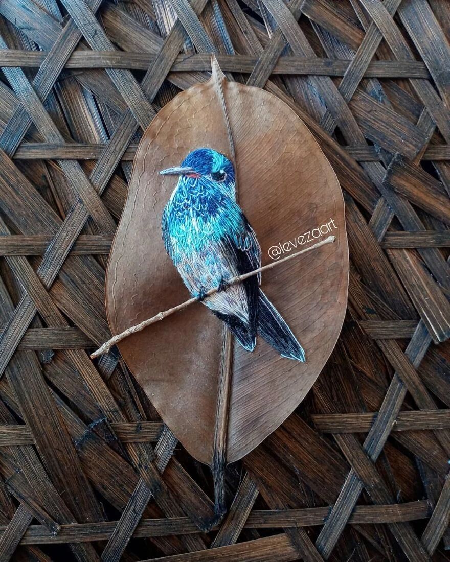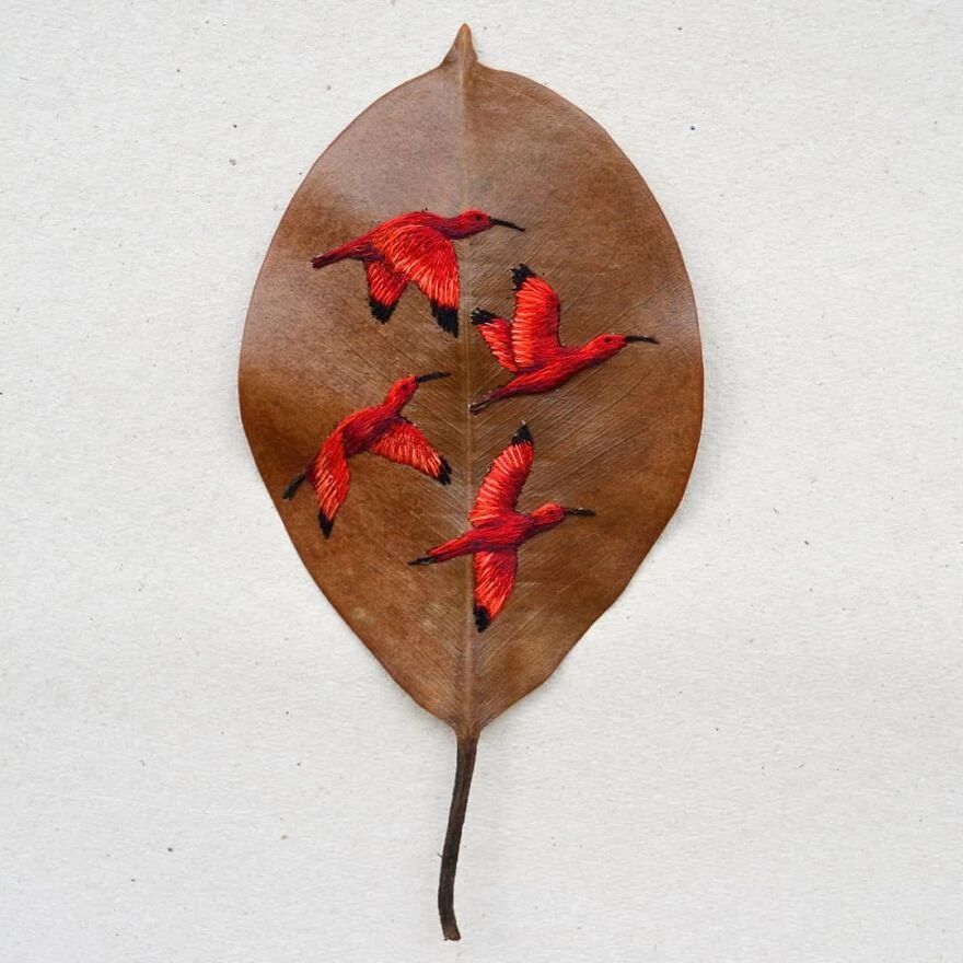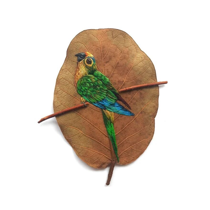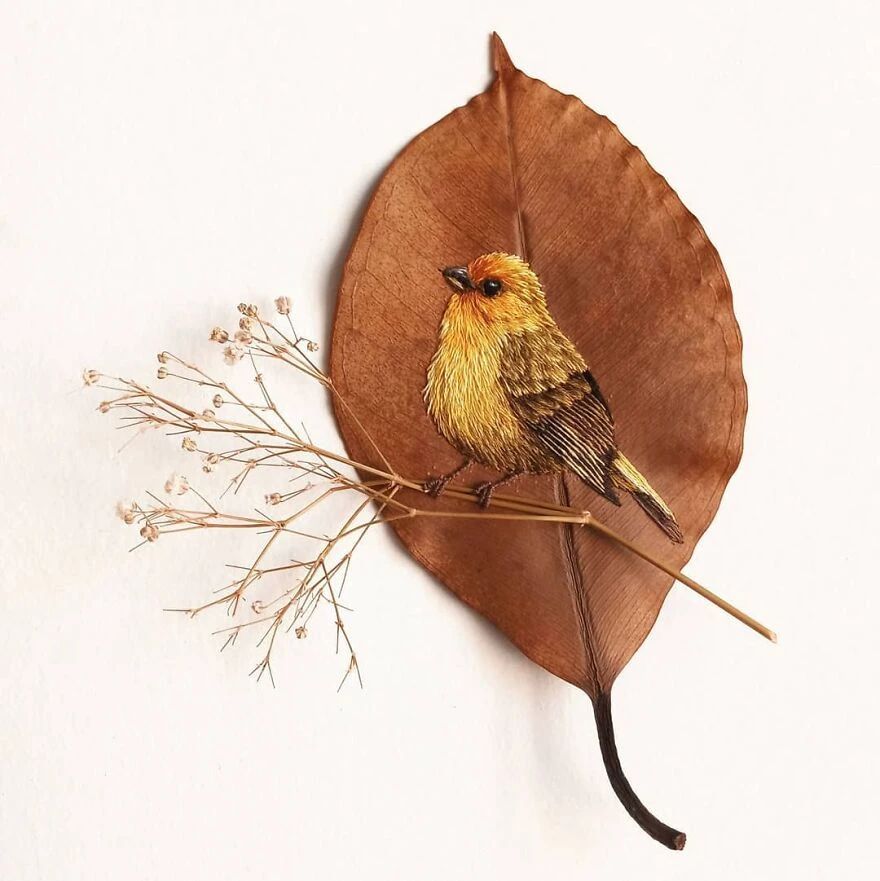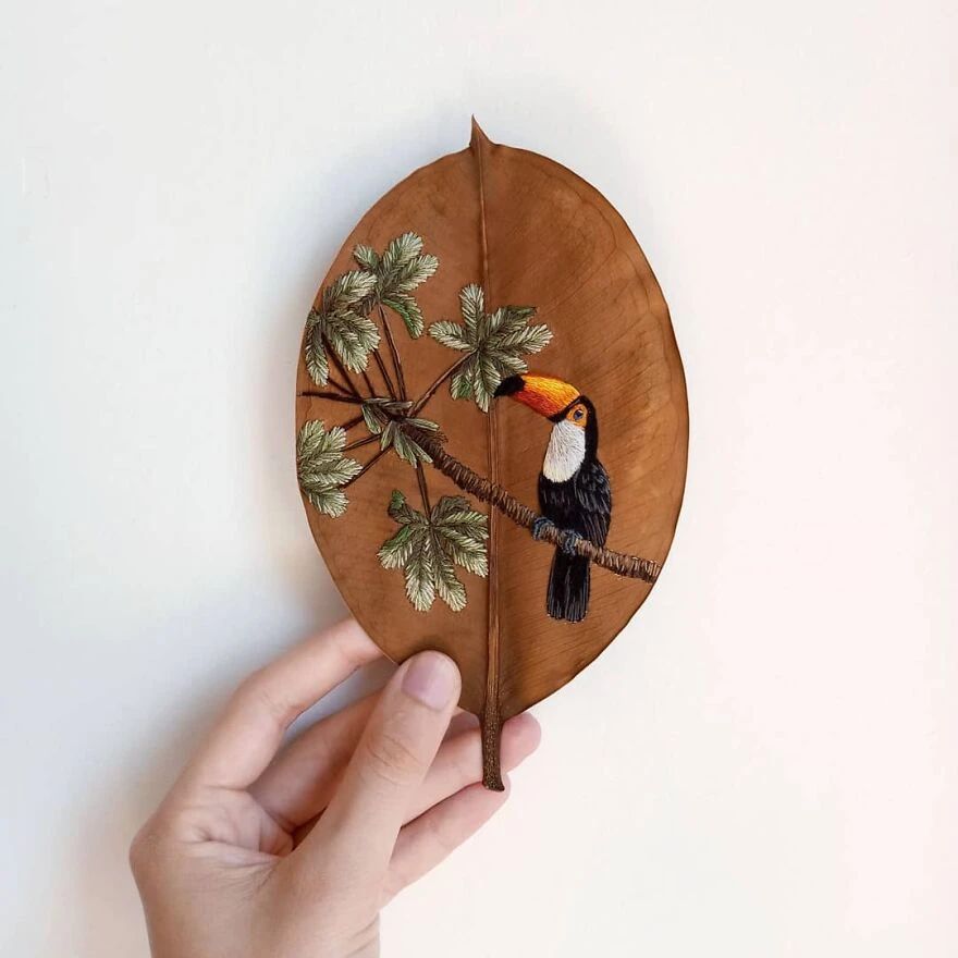 她的作品让很多人意识到,原来精致的艺术品也不需要多么昂贵的材料,随手捡一片落叶就够用了。劳拉在树叶上刺绣而成的鸟儿,种类繁多,从橙色喙的巨嘴鸟,到红宝石喉蜂鸟,精准还原了每一种鸟的特征。劳拉对细节的观察和还原,近乎达到了完美,不仅仅是鸟的羽毛、翅膀上的复杂图案,还有光影的叠加,以及颜色的运用。