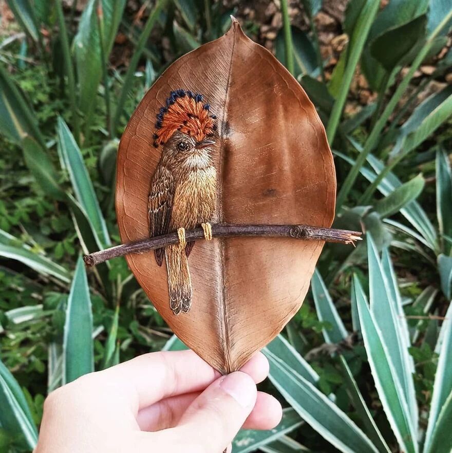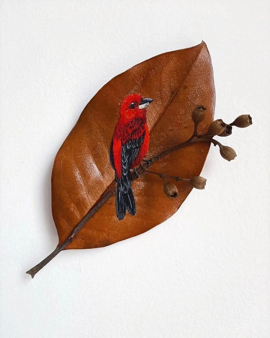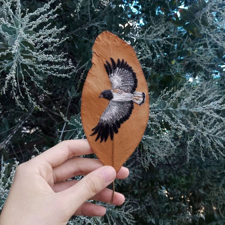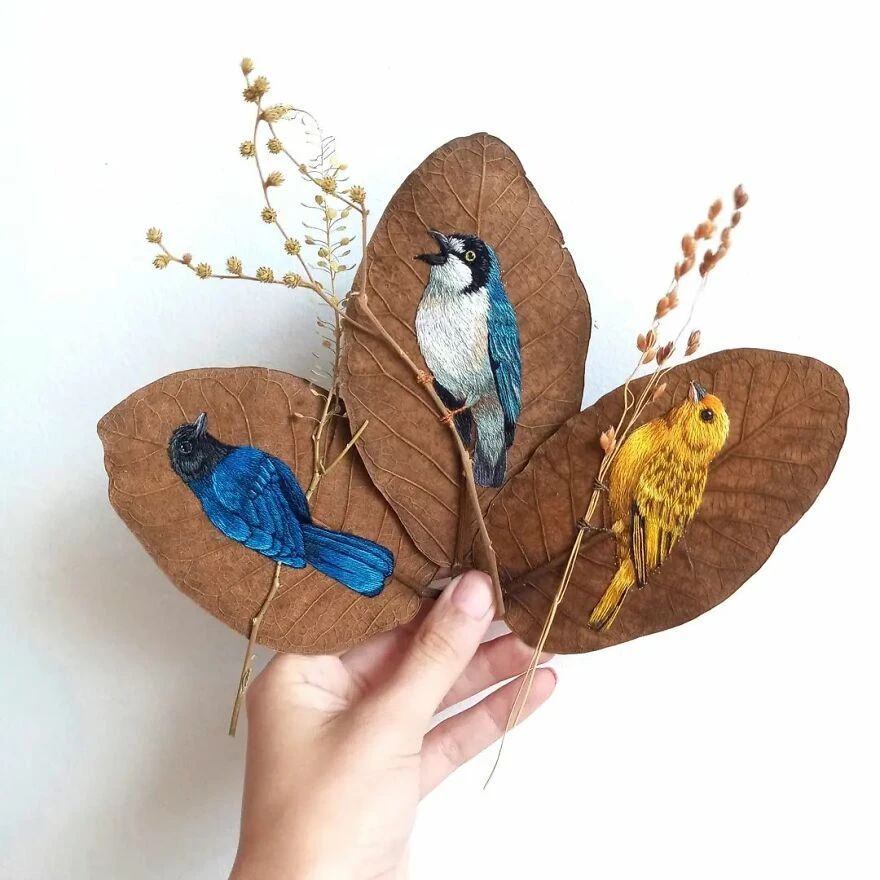她的作品让很多人意识到,原来精致的艺术品也不需要多么昂贵的材料,随手捡一片落叶就够用了。劳拉在树叶上刺绣而成的鸟儿,种类繁多,从橙色喙的巨嘴鸟,到红宝石喉蜂鸟,精准还原了每一种鸟的特征。劳拉对细节的观察和还原,近乎达到了完美,不仅仅是鸟的羽毛、翅膀上的复杂图案,还有光影的叠加,以及颜色的运用。
