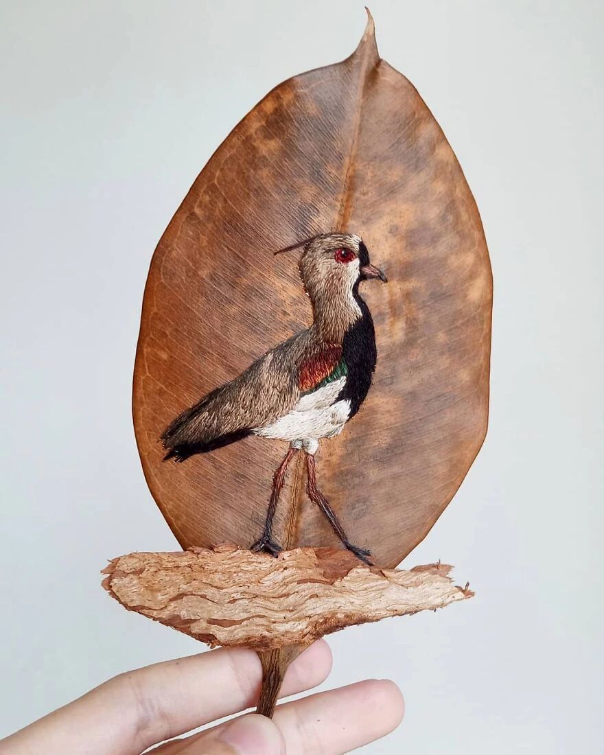 劳拉用刺绣展示出了鸟类的灵动感和缤纷毛色,栩栩如生的鸟儿在枯叶上展现出无穷的生命力,这也是在残酷地告诫人们,它们即将濒危的事实。劳拉希望通过这种创作来唤起人们保护大自然的意识,并认识这些濒危物种以及他们所面临的生态破坏。