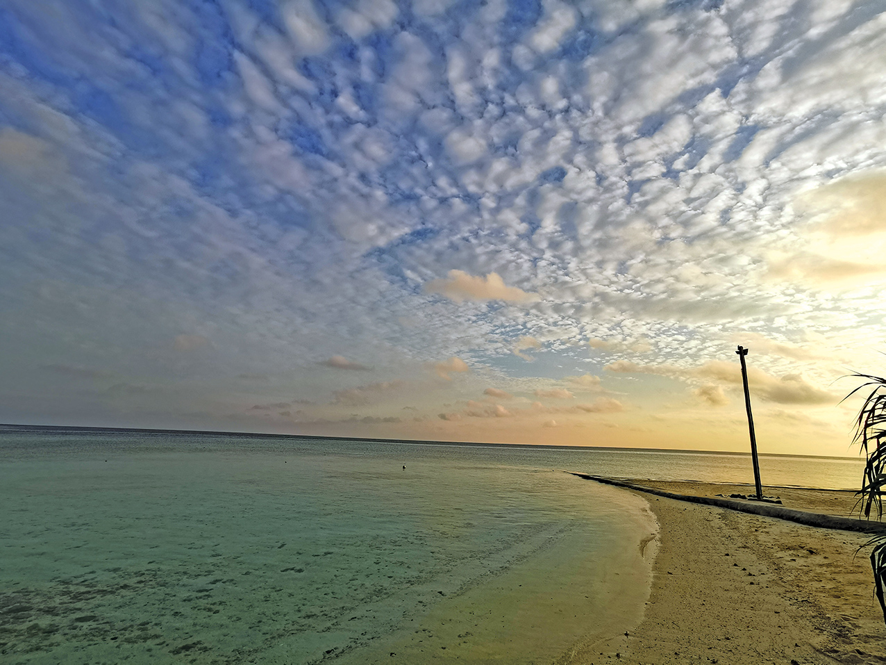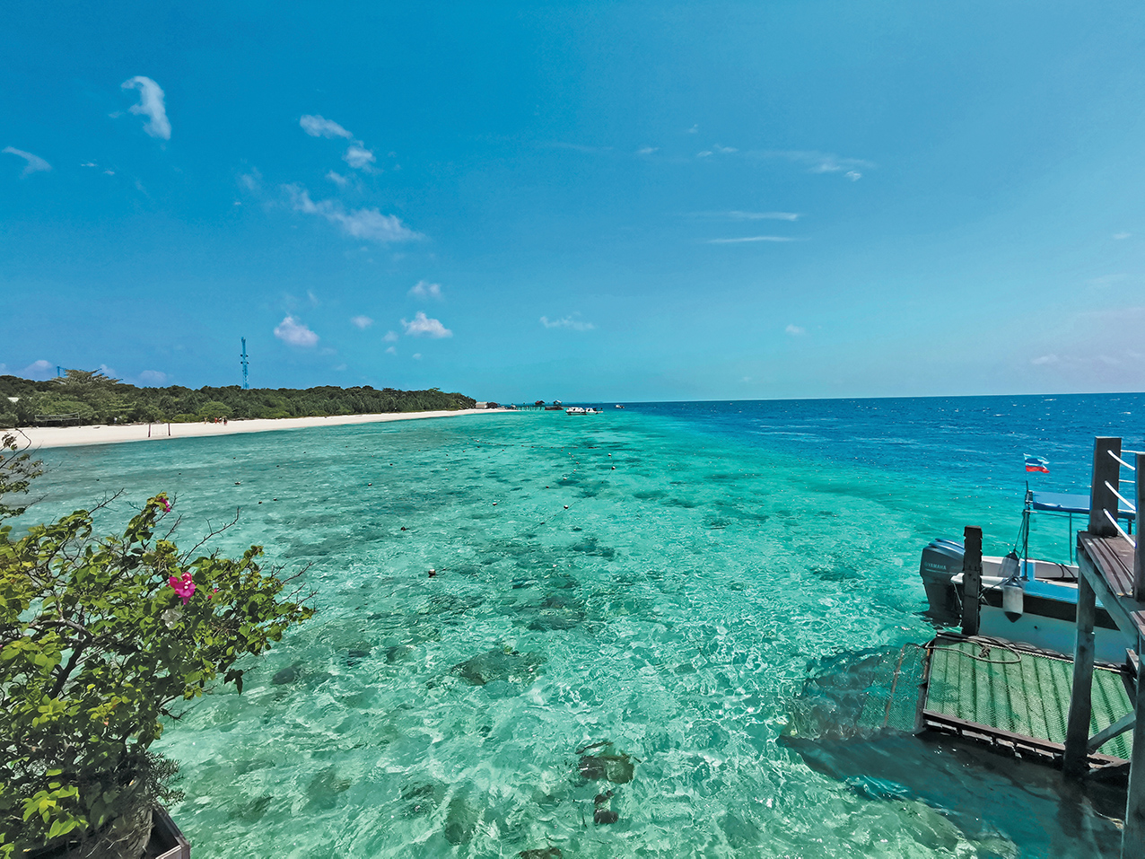 放眼望去,一望无际的海面,渐层蓝绿极为疗愈——稍远处明确一条界线,把眼前的碧绿与温柔的蔚蓝,划开成分明的壁垒;那蓝,延漫至天际,终过渡成深沉的湛蓝。水波轻荡,日光无声,如此,静谧。