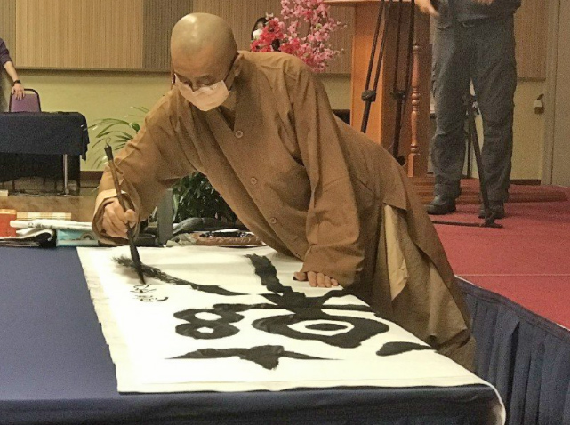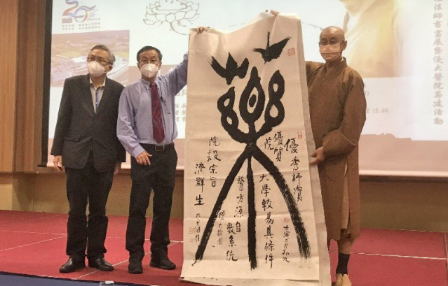 继程法师现场挥毫,写出“药”字,把作品捐赠优大,左起为尤芳达和何国忠。