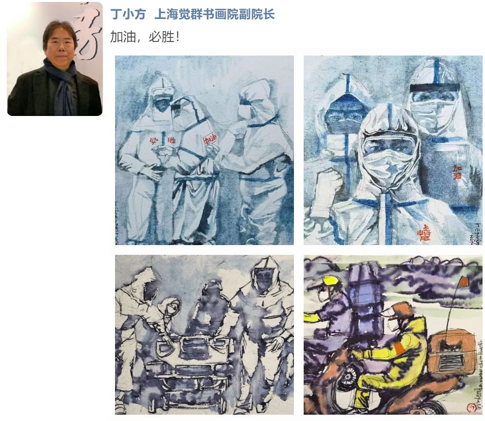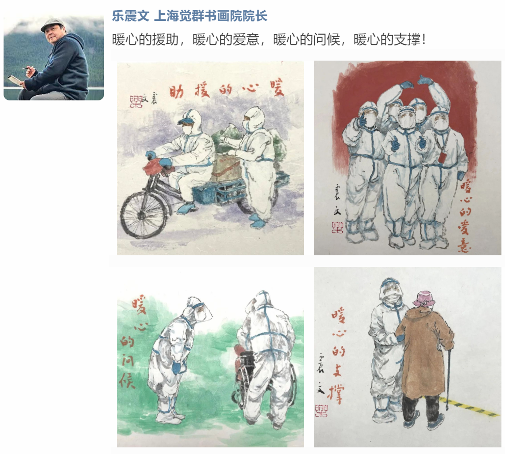 有的用画笔描绘医护工作者、志愿者们的忙碌身影,向他们致敬;挥毫书写书法作品,为上海的抗疫工作、为居家隔离的人们加油鼓劲。