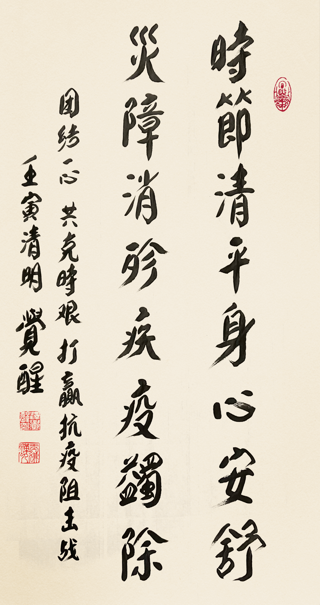 中国佛教协会副会长、上海玉佛禅寺方丈觉醒大和尚挥毫书写“时节清平身心安舒 灾障消殄疾疫蠲除”