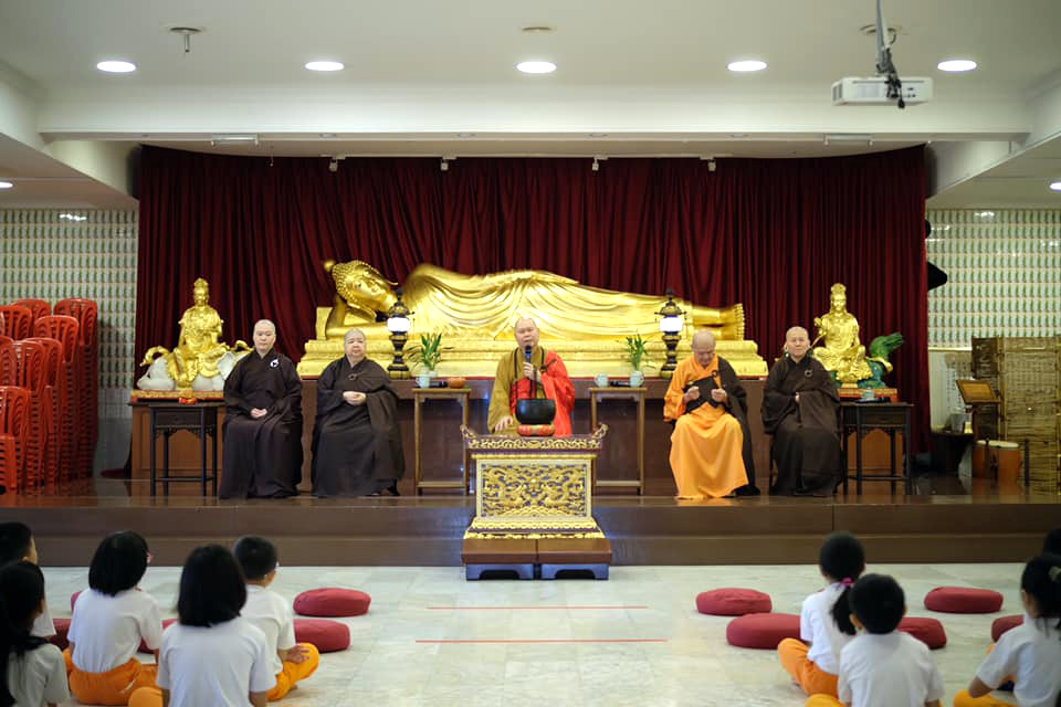 载送前来的父母目睹他们怀着大慈大悲的心绪,昂首走进佛陀的怀抱。 此时此刻,佛光氤氲的观音亭是人头攒动的,就为开展鹿苑的文化千秋大业而忙碌。 饶富经验的佛学班老师们恭候在那庄严的卧佛殿内,迎接着一颗颗幼苗,致力将他们扶植成一棵日后的参天大树。