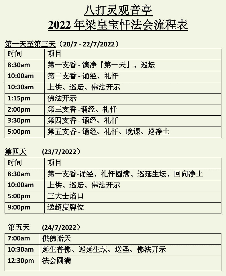 八打灵观音亭择定于2022年7月20日至24日(壬寅年六月廿二至廿六)启建【护国息灾冥阳两利梁皇宝忏大法会】。