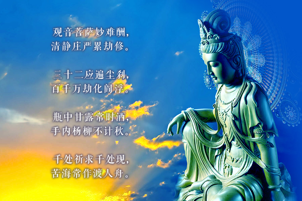 观世音菩萨愿力弘深、智慧广大、三身圆满,《悲华经》中观世音菩萨发如是大愿:“愿我行菩萨道时,众生受诸苦恼恐怖等事,无有救护,无依无舍。若能念我,称我名字,为我天耳所闻,天眼所见,是众生等,若不免此苦恼者,我终不成阿耨多罗三藐三菩提。”