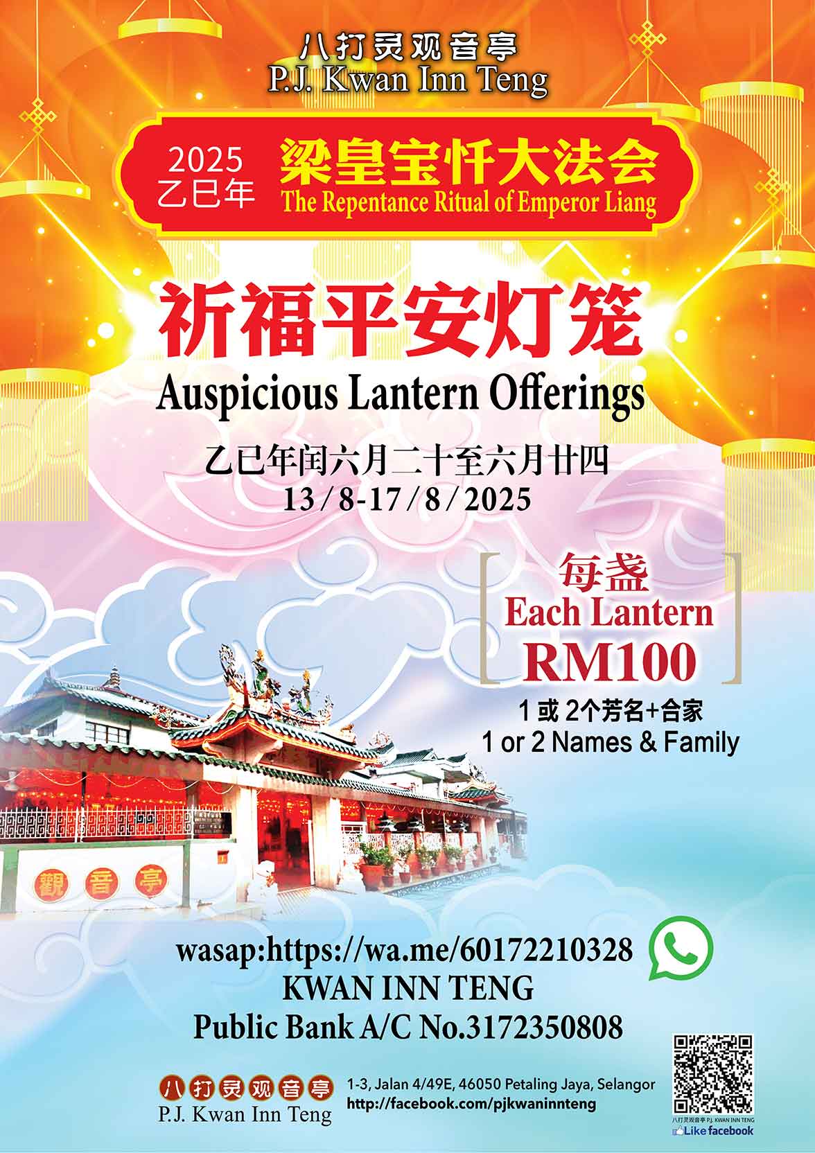 PJ Kwan Inn Teng will be conducting The Repentance Ritual of Emperor Liang from 13/8/25 -- 17/8/2025.