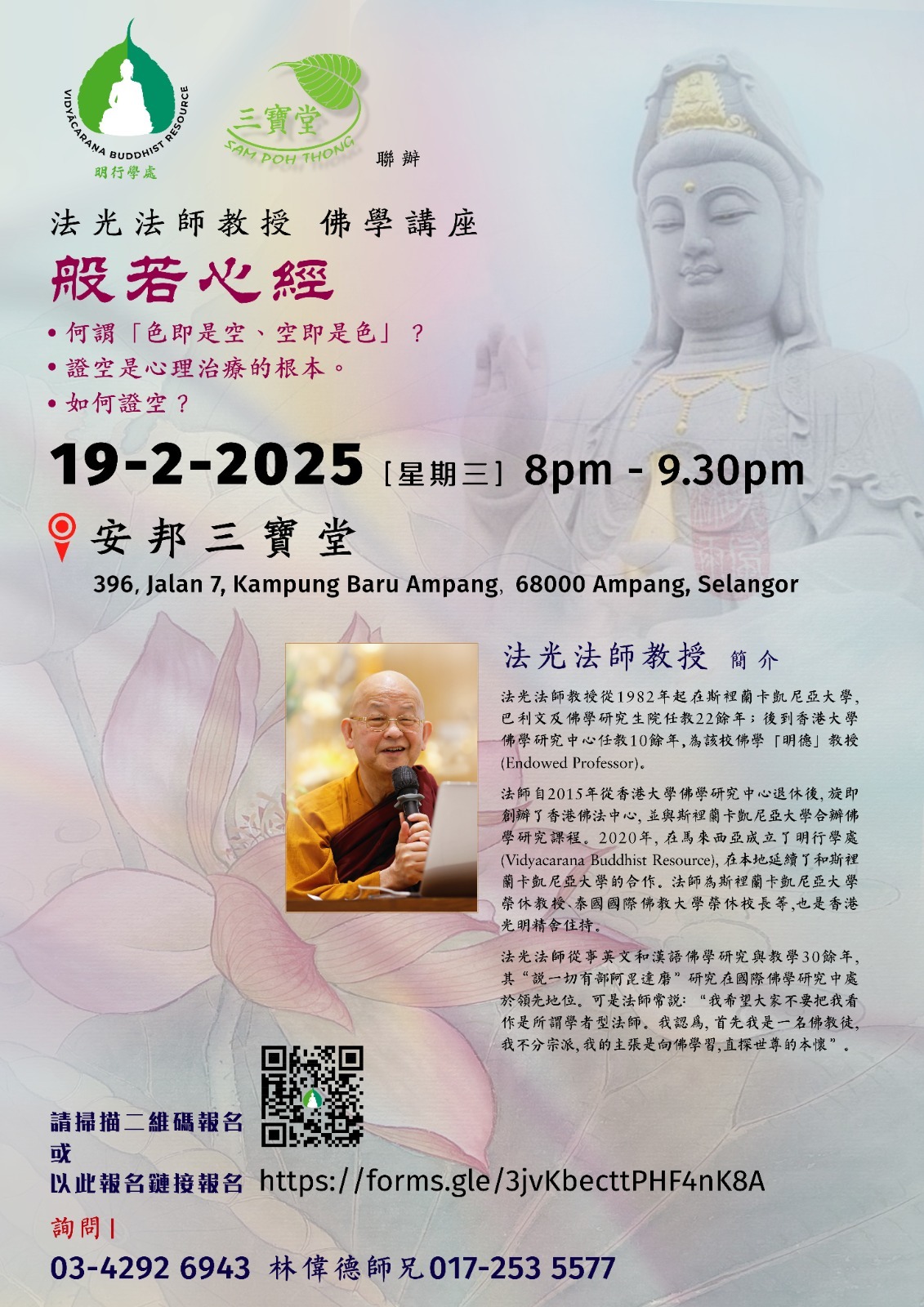吉隆坡安邦三宝堂定于2月19日晚上8时正邀请法光法师教授主讲《《般若心经》,何谓 “色即是空、空即是色”?证空是心理治疗的根本。如何证空?此项佛学讲座入场免费,欢迎公众人士踊跃参加,共沾法喜。活动详情请联络三宝堂:03-4292 6943 , 017-253 5577。