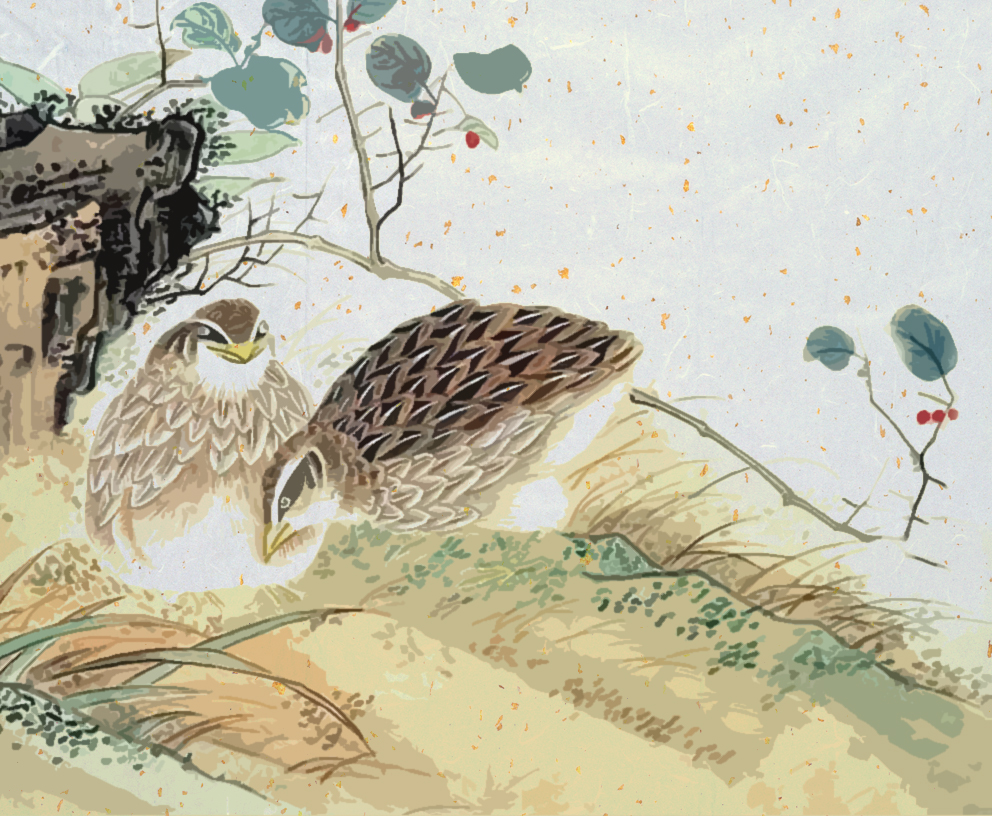 另一只鹌鹑则说:“你持网时,发毛将落!请君持网飞腾!”前之鹌鹑反驳:“你持网时,羽毛脱落!请君持网飞腾!”