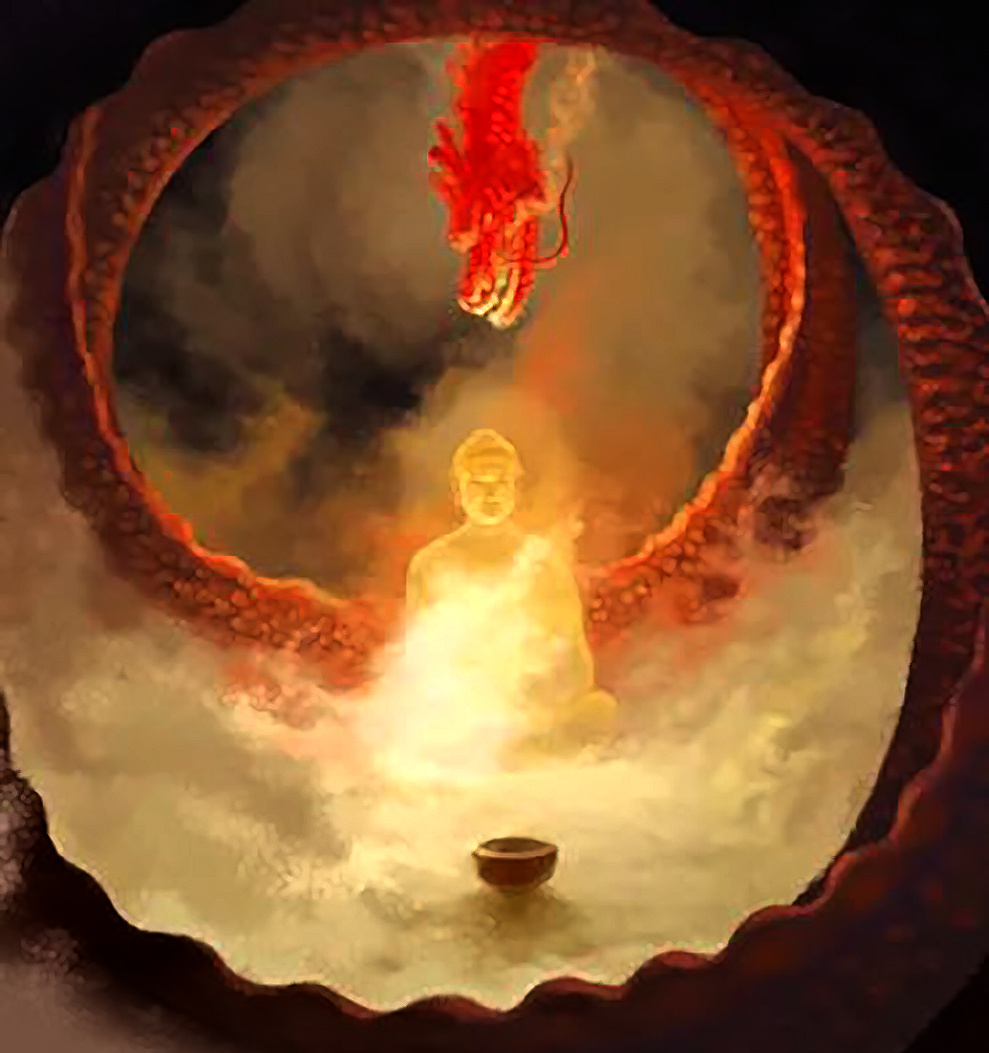 渐渐地,当火光沉寂,灰烬狼籍中出现了世尊端坐不动、容貌怡然的身影,佛陀的慈悲力,降伏了恶龙的瞋心毒火,为它三皈依后,将其收入钵中。