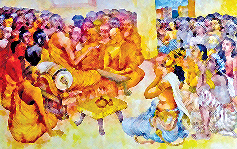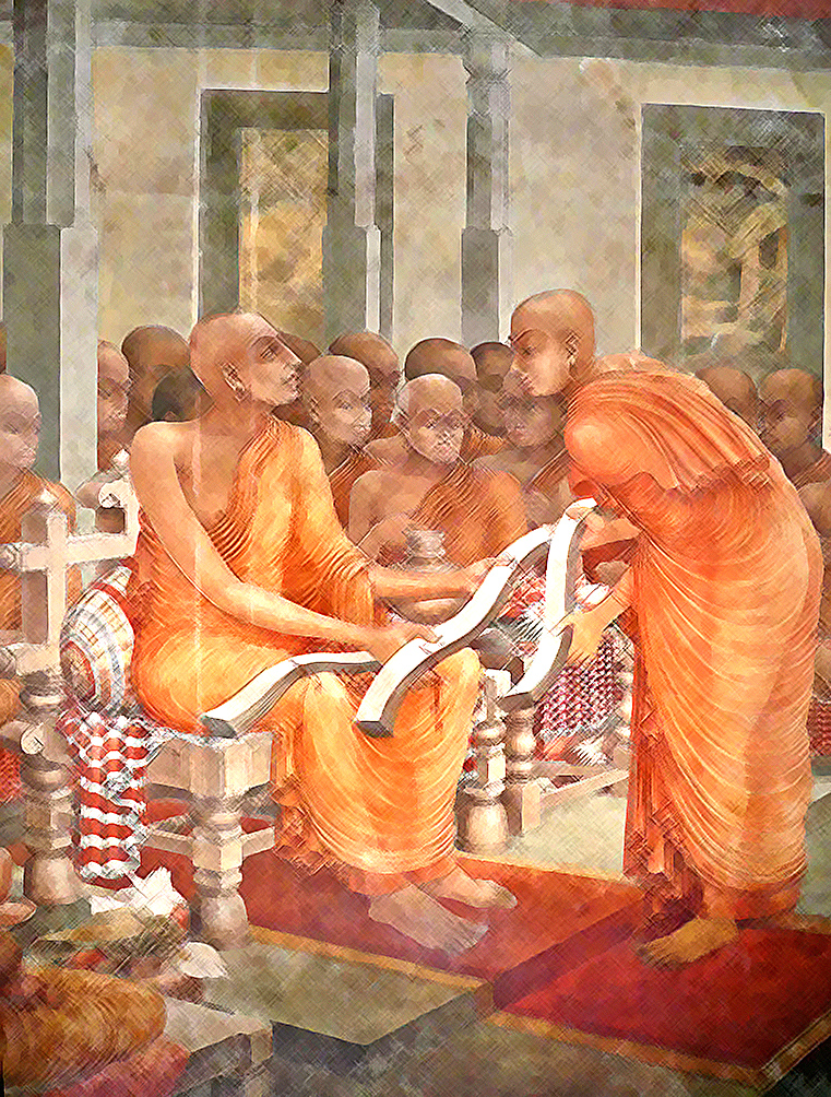 觉音尊者将写好的《清净道论》交给僧团长老。