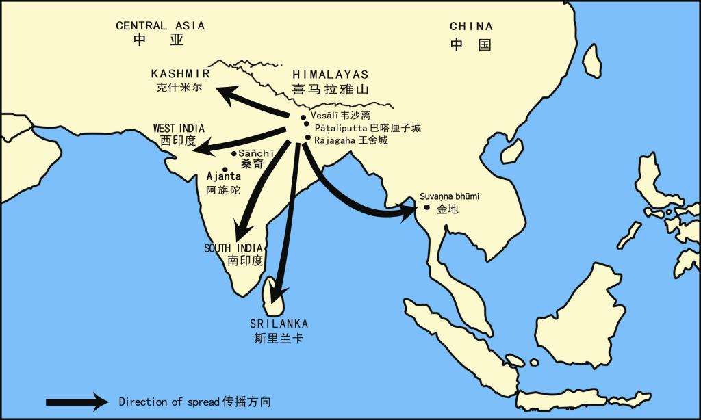 在这次大会之后,阿育王又派遣僧侣四出传教,摩哂陀尊者(出家前为阿育王的儿子)率领四位长老和一位沙弥,前往僧伽罗国(又称“师子国”,即今斯里兰卡)建立僧团,传入三藏经典,僧伽罗国王室将王室的亭园捐出,建立寺院,让僧团居住,称为大寺。其后僧伽密多尊尼(摩哂陀尊者的俗家妹妹)也前往斯里兰卡,建立了比丘尼僧团,并且将佛陀在菩提伽耶成道时所在菩提树的分枝,带往斯里兰卡,种植于大寺之中,这是斯里兰卡佛教的开始。