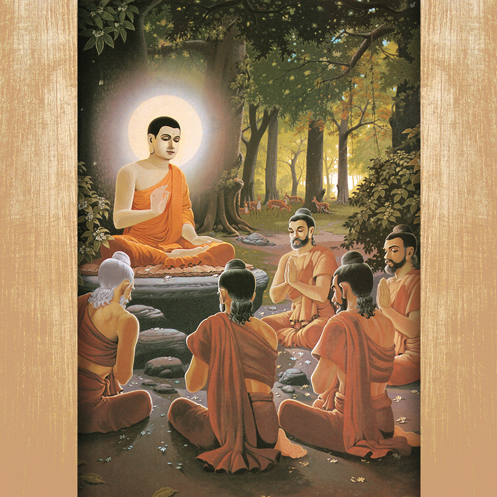 世尊观察五人的根机皆已成熟,得度的因缘到了,于是告诉他们:“憍陈如!你们当观察世间的种种苦相,有五阴炽盛苦、生苦、老苦、病苦、死苦、爱别离苦、怨憎会苦、求不得苦。在这世间上,无论有形或无形,无足、一足、二足、四足或多足的众生,都脱离不了这些苦患,为什么?譬如刚燃完的灰烬,若一遇干草,旋即复燃。世间众苦,皆由我执而生,若有一丝丝我相,就会招感执着之苦。贪、瞋、痴亦从我执而生,犹如种子能萌芽,此三毒亦是所有苦患的成因,使众生在三界中轮回不已。所以,若能灭除我执及贪瞋痴三毒,诸苦亦从此而断,这一切须从修行八正道做起,就像以水浇熄炽火,才不会死灰复燃。