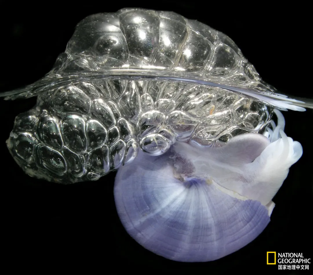 紫螺(Janthina janthina),也被称为紫罗兰蜗牛,它们用充满气泡的粘液建造木筏来保持漂浮。|国家地理图片集