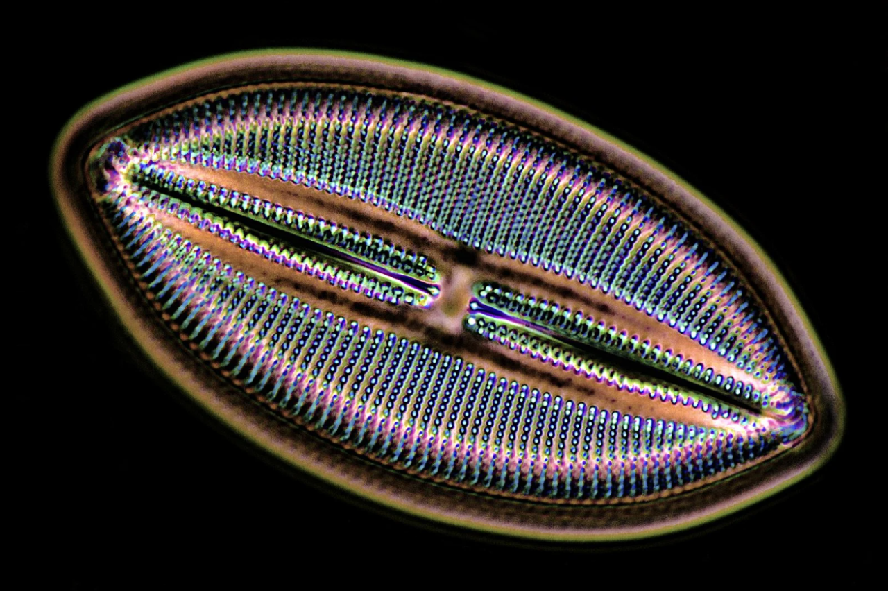 硅藻是一种极小的单细胞藻类,大多只有几微米到几十微米长,一根针尖上就能放下好几颗。但如果你用显微镜观察这些小生物,一定会为它们精致的外形所震惊——事实上,你看到的这些精美结构是硅藻的细胞壁,也被称为它的“硅制壳体”。