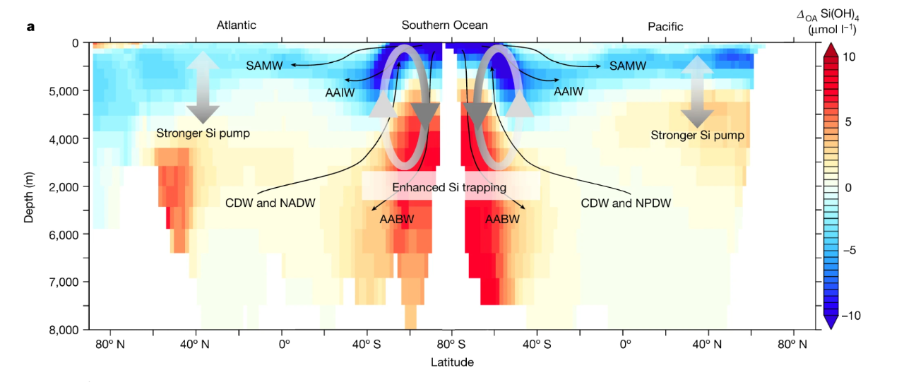 进一步的模型研究带来了更大的忧虑。硅在海水中的分布主要受到“硅藻泵”和海洋环流运输两个因素的影响。然而在海水严重酸化的情境下,壳体的溶解速度减慢,更多的硅藻死后壳体会直接沉入海底,并长期地沉积在那里,不能向上层海水补充足够多的硅。海洋环流显然补不上这份空缺,那么之后生长的硅藻就无法获得足够的硅来制造自己的外壳。