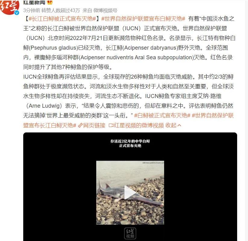 国际自然与自然资源保护联盟,发布全球濒危物种红色目录更新报告,宣布白鲟灭绝,长江鲟野外灭绝。