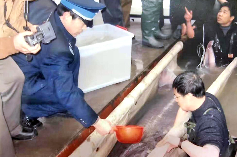 他们就这样在冬天寒冷的江水中站了一夜,直到白鲟鱼鳃张合恢复正常,渔民们才上来。