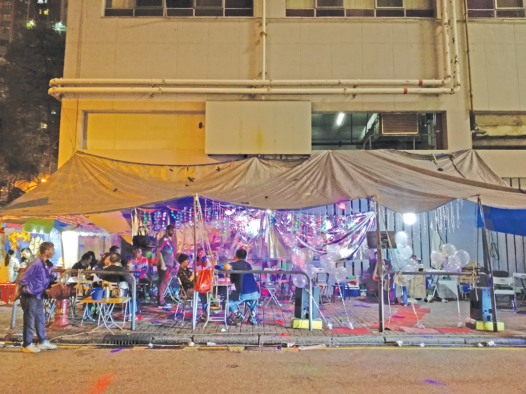 帐篷底下挂满了红蓝LED彩灯泡,自顾地交错闪烁着,试图与极其炫目的迪斯哥银白色圆灯球争艳。人群开始聚集在帐篷前或对面的人行道,或目不转睛双手放在身后或举起手机,围观帐篷下的男男女女不顾旁人欢乐起舞,播放着节奏感超强的生日歌,嬉闹、喧哗。