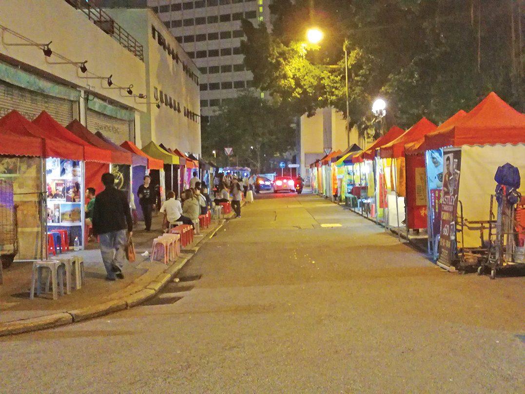隔壁帐篷亦不甘示弱,中年男子使劲地唱着耳熟能详的中文流行曲,铿锵有力,一首情歌顿时添加了一份江湖味。虽然少了炫目的灯光效果,不过昏黄圆灯底下,音响设备不缺、捧场的观众也挤满了两张五人桌。