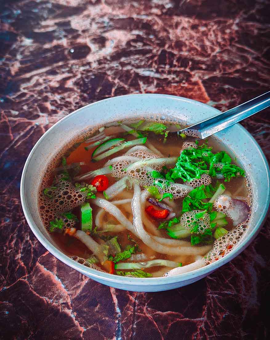 看着眼前一碗热腾的汤面,我喜欢先喝下一口汤,尝尽汤头的鲜甜、浓郁,一阵暖胃的满足感涌上心头,让接下来的每一口都变得特别踏实,得以全心投入进食过程。过了午餐时间都还未进食,肚子饿得快发慌了,还要遇上闷热的天气,那种呼吸都是湿湿潮土味的“下雨的味道”,不难闻,却足以让我汗流浃背。这个时候吃上一碗汤水清丽的 Laksa Lubuk,刚刚好。刚刚好,不过辣、不过酸,暖胃又实在。好久都没有尝过这么纯粹的味道了,美味尽在一碗低调的汤底。叻沙汤底利用柴火熬制而成,用的是每日手工斩碎后,所取出的鱼骨和细滑鱼肉,简单的调味让鱼肉尽显其鲜。汤底未见其物,但闻其香。入口,清爽的汤底夹着淡淡的柴香味,味蕾刹那苏醒,尽扫闷热天气的抑郁。如果你喜欢刺激、浓郁的汤底口味,还有辣椒、桔子、虾膏无限供应。不仅如此,还可以多加一颗水煮蛋增加饱足感。纯粹的味道最让人难忘。Laksa Lubuk是表姐的男友带我们去吃的。远在新加坡打拼的他,说是只要回家,无论如何一定要吃上一碗,才算是圆满。犹如世外高人隐居的深山处,Laksa Lubuk 位于偏离江沙市区的马来甘榜里,从市区驱车还要约半小时,再转入一条蜿蜒曲折的小路,经过几间马来甘榜屋,继续前进至小路的尽头,就能看到一个宽敞的停车空间,大家有序地把车子停好之后,就往那个顶着锌板屋顶的典型马来小食店前进。这里,就是表姐男友一解乡愁的地方。店家从1960年开始售卖Laksa Lubuk,之后将食谱传授给孩子。孩子每天早上都会手工搓面团、制面条。面条采用麦粉而制,细滑且带点粘性,用汤匙舀起来吃那长长又圆身的面条,着实有点不方便。不过爽滑不粘牙的面条,配上清甜爽口的汤头,却意外地天衣无缝,吃一碗绝对无法过瘾。在吃汤面时我们们总是面对选择,先尝一口汤头?或是先吃面条为快?原来最终的结果并非关乎先后。无论是先喝汤还是先吃面,最终都是为了那一刻纯粹的享受,那一口美味的记忆。Laksa Lubuk汤底低调的香气、面条的细腻,每一丝每一味都是味觉的盛宴、一段时间的定格,让我回味无穷。在这里,终于找到了一种真实的满足,一份纯粹的味蕾享受。