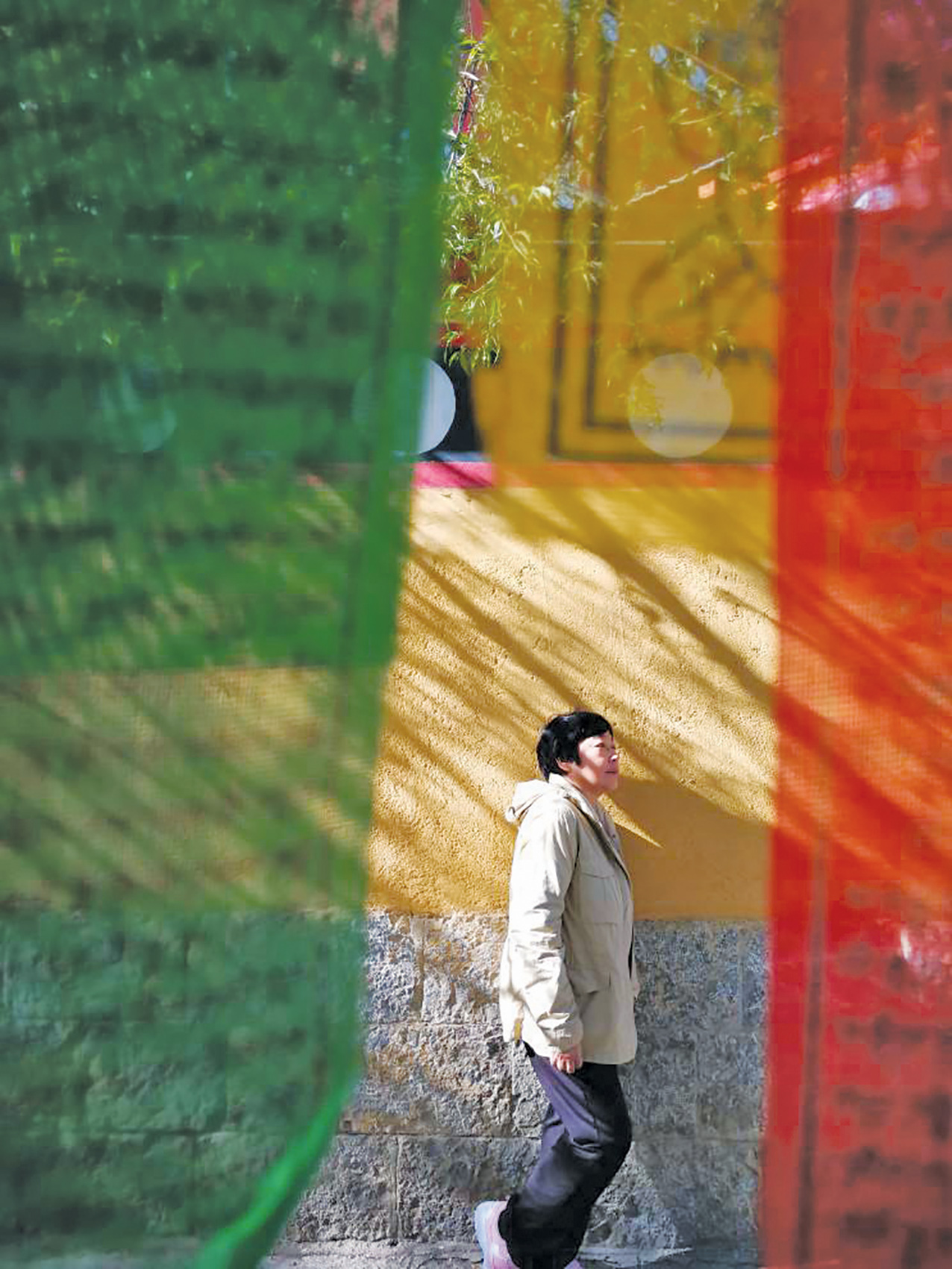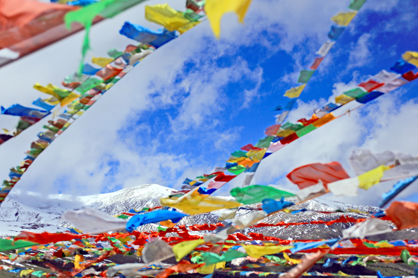 静卧香格里拉山脉的喇嘛寺院,色彩亮丽的亭台楼阁缠绕在山腰,蓝、黄、绿、红、白色经幡,集合着金、木、水、火、土的意识,在人们头顶飘扬庇护。