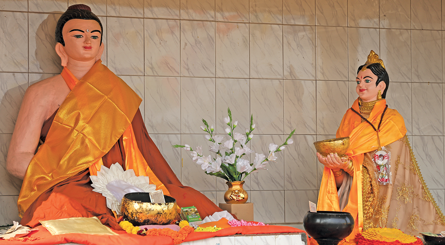 释迦牟尼佛当时为求解脱而舍弃王位,出家修道。在这六年苦行中,每日仅食一麻一米,衣杉褴履,瘦骨嶙峋,形如枯木。释迦牟尼意识到如此苦修不是通往解脱的正确道路,决定放弃苦行,另辟蹊径。这时一位牧羊女见到他如此虚弱不堪,便献乳糜供养。佛陀吃了之后,体力恢复,来到岸边一棵毕波罗树下,静坐沉思,发誓“今若不证无上菩提道,宁可碎此身而终不起于座”!经过七天七夜的思考,于腊月八日,释迦牟尼佛终于豁然大悟,了知三法印、四圣谛、八正道等真谛,得到圆满的彻悟而证佛,“腊八”就成了“佛祖成道纪念日”。