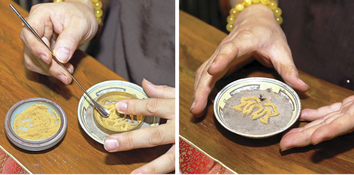 “香供最重要的是在于它的香味而非烟雾。我们不可以用太多木屑,木屑很经济,但产生很多烟。所以只可以加一点点,比如甘文烟是乳香类的,是粘性的,可以加入一些檀香粉或其他香料类中和其味。因此我们自己要做合香,不是买了就随便直接用上。”