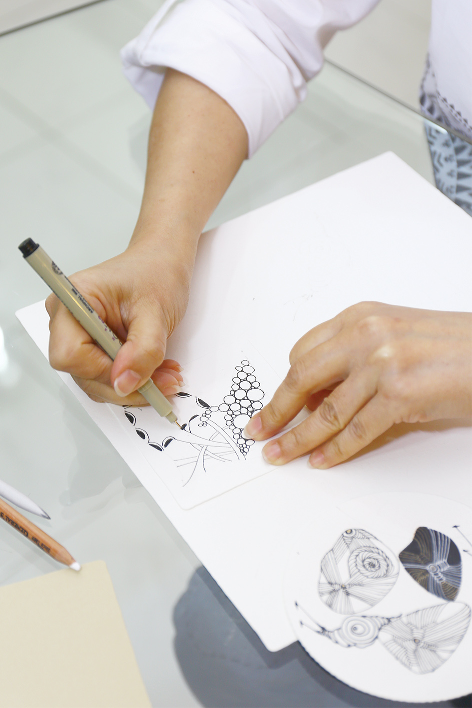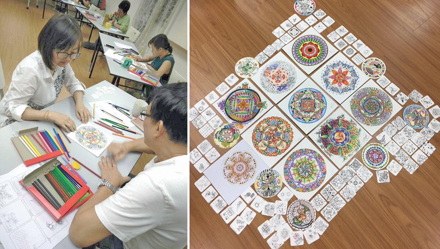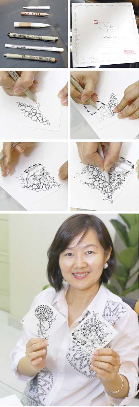 “禅绕只须要一张纸和笔,也不须要去在乎结果,而是一再觉知每一笔触的当下和享受过程。每一次作画的时候,都能够通过不一样的图形和结构,去看到自己的执着和想法,也同时训练专注力,因为一时的不经意或散乱都会导致画错了某个图案。”