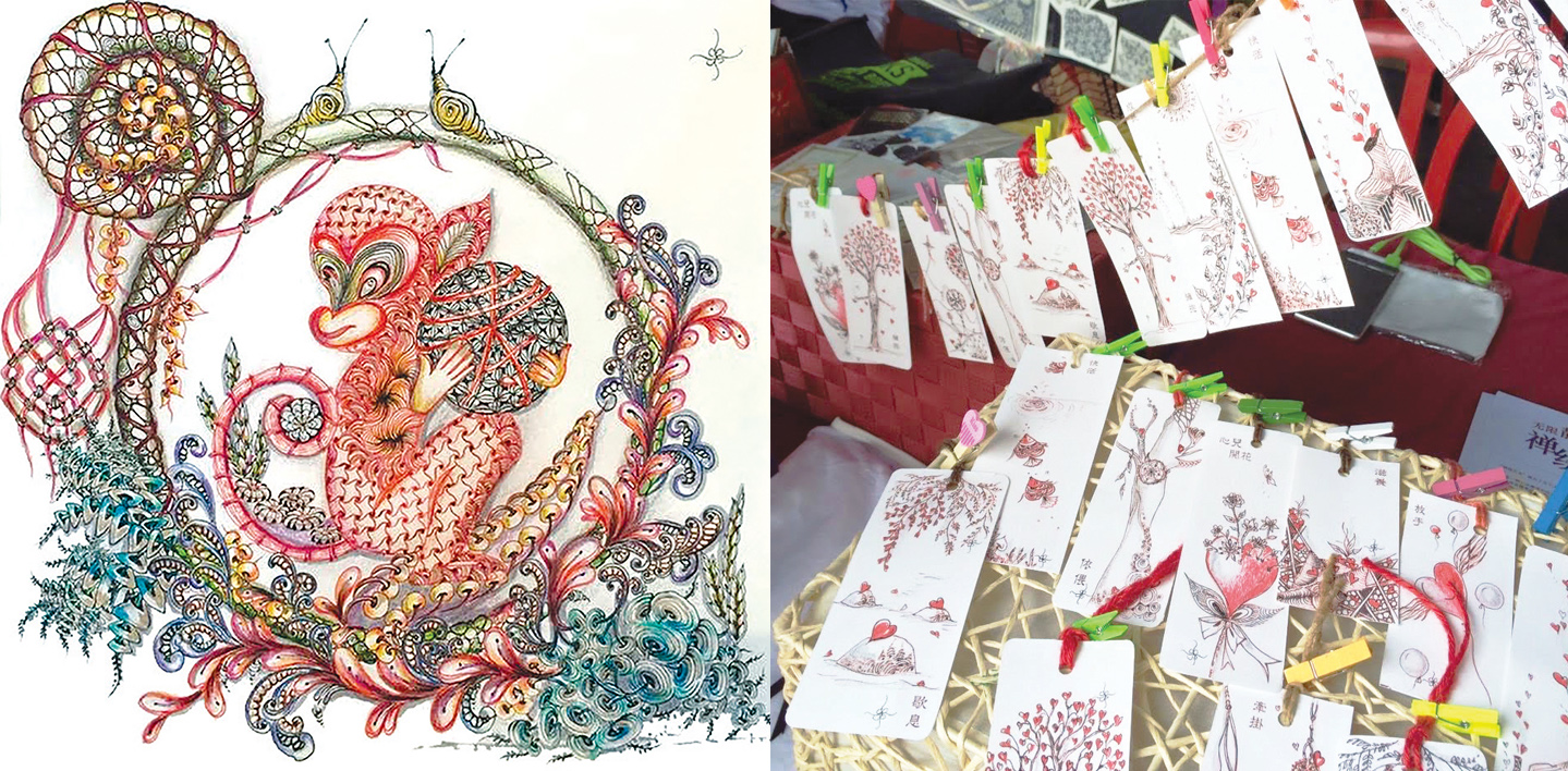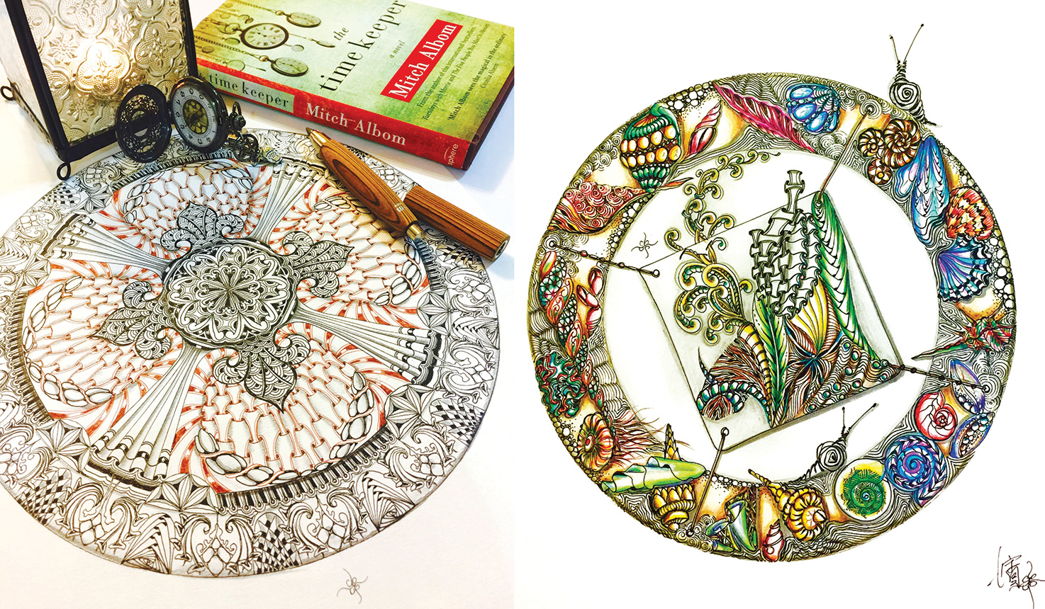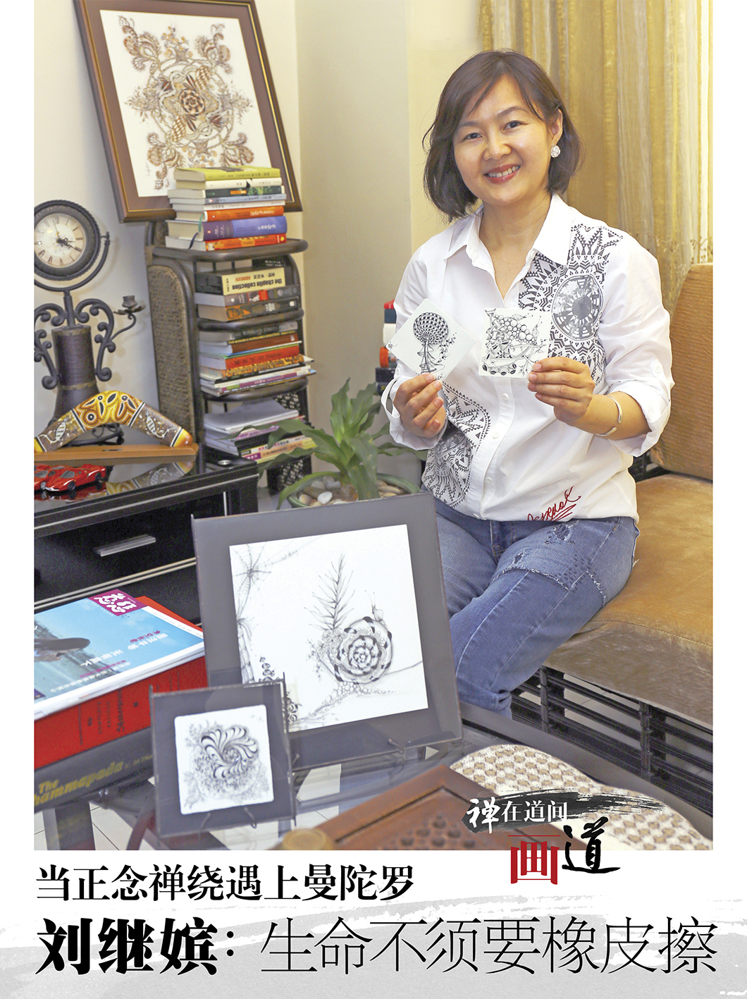 “禅绕只须要一张纸和笔,也不须要去在乎结果,而是一再觉知每一笔触的当下和享受过程。每一次作画的时候,都能够通过不一样的图形和结构,去看到自己的执着和想法,也同时训练专注力,因为一时的不经意或散乱都会导致画错了某个图案。”