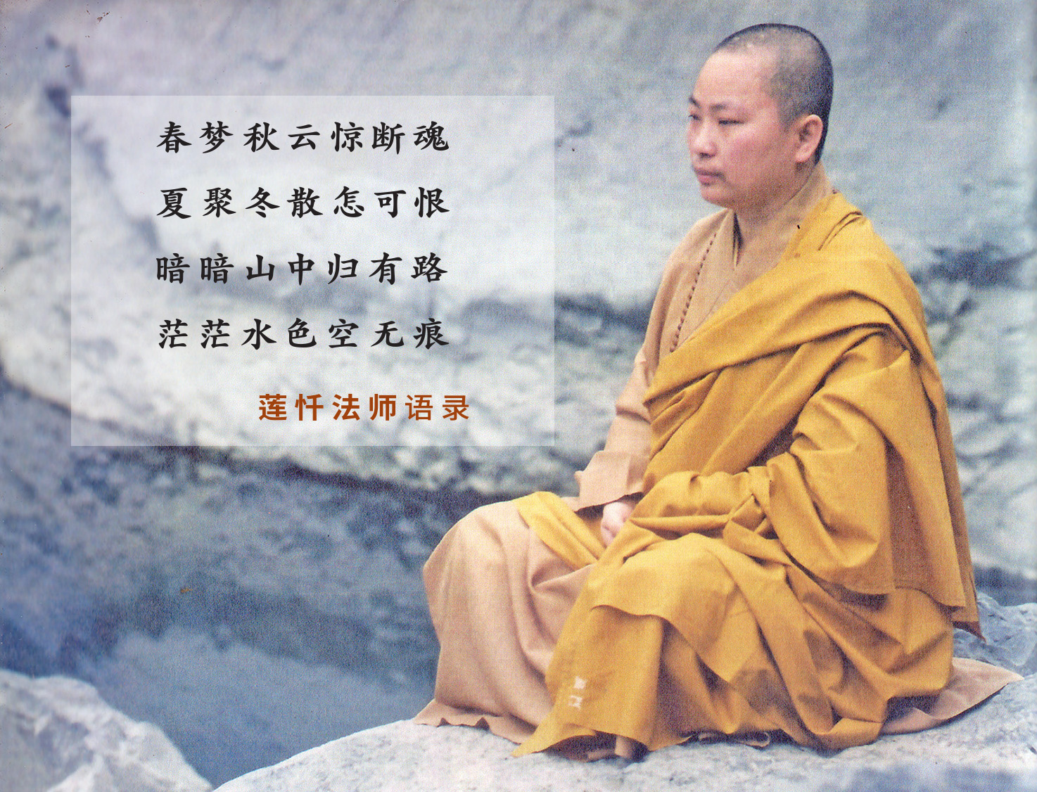 “结缘人间修,悲喜为何留?生灭恒不碍,东西任我游!”莲忏法师致力从事社会服务工作多年,为悟明长老印可,并被明盲界尊称是“盲人导师”。