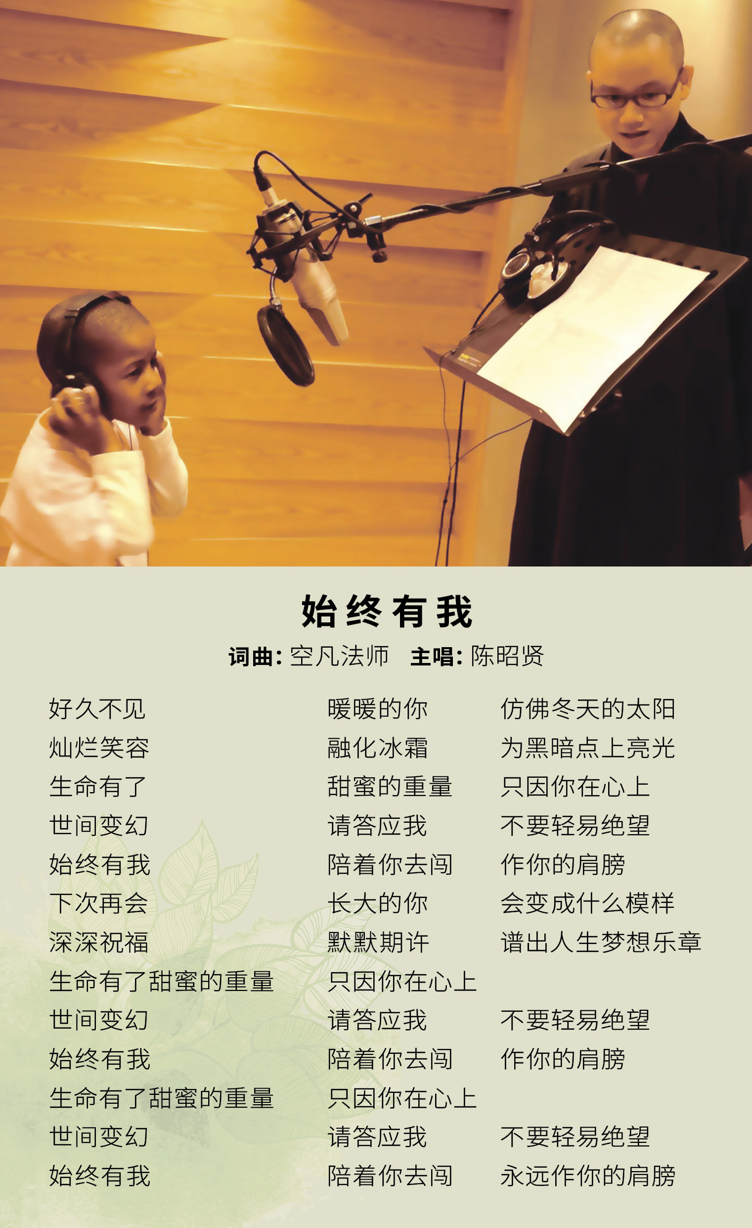 一天晚上“突发奇想”,一直以来都是写词、写曲让孩子唱,这次想来点不一样,也是我第一次那么直接表达内心的情感,于是动笔写下这首“始终有我”送给孩子,同时也邀请曾赴非洲教导赖索托孩子歌仔戏的昭贤特别献声。对绍贤印象极为深刻,她给孩子的爱总是那么真、那么多,或许大家一样爱着孩子,对她总有一见如故的感觉。