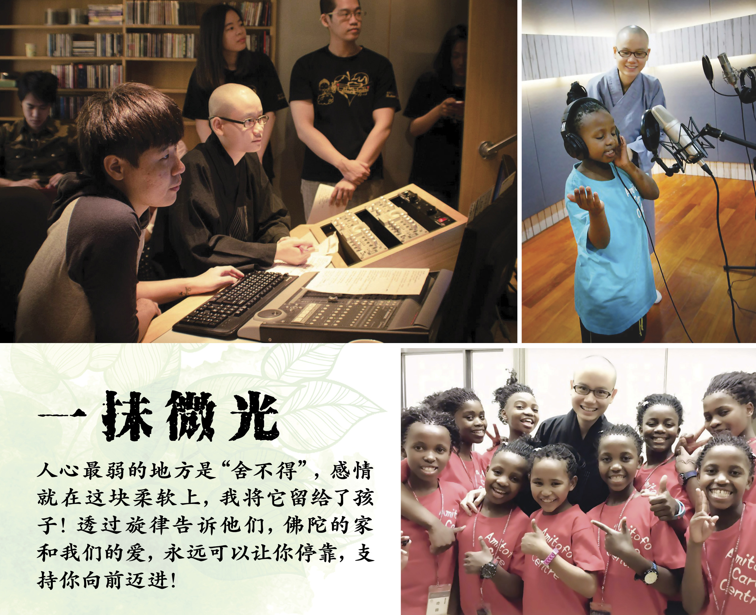 冬日暖阳已去,时间不知不觉地溜走,每次和孩子相处时间虽短,可总会想念;在一起的这段期间,越走越深越像亲情,孩子的贴心与懂事,不时清晰刻在心上。2014年底在台湾展开的“行愿非洲,感恩之旅”,孩子的行程很满,能录音时间也很少,跑了好几趟明华园才顺利收了音,每次扛着一堆录音器材,教练和孩子总会贴心上前帮忙,每每被温暖击中的瞬间,满溢感动。