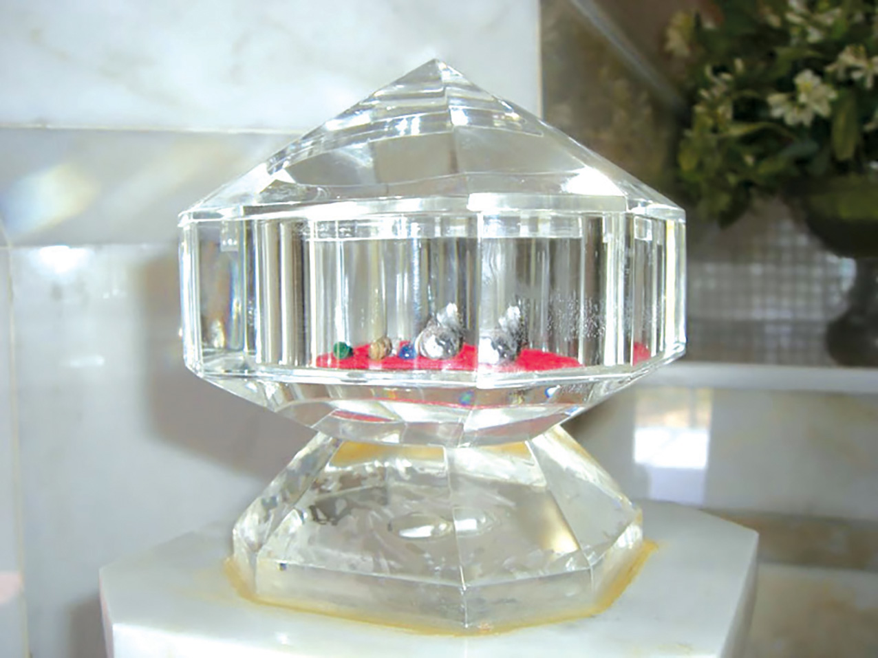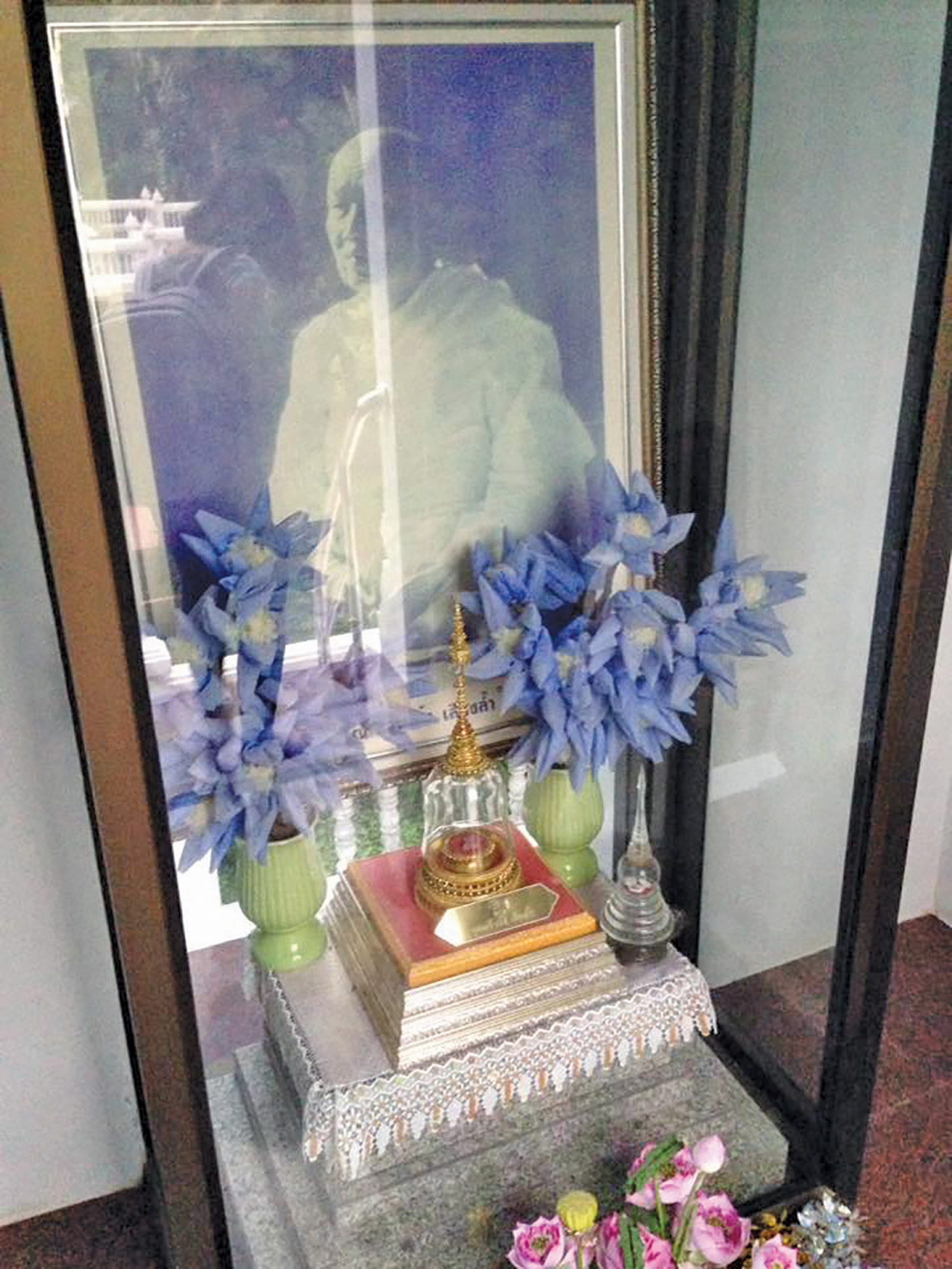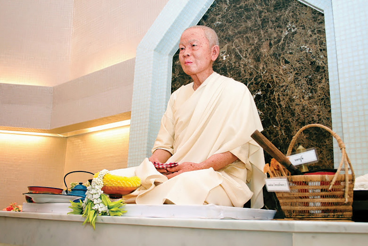 纪念塔里面,美琪乔像宝石那样璀璨的舍利显著地摆在供桌上。这里有三尊真人大小的美琪乔塑像;一尊是混合材料制作的立像,安置在亭子里;一尊是精致的蜡像——美琪乔披着白袍的坐像,安奉在第二层的佛台上;还有一尊美琪乔行禅的玻璃纤维像,则摆在第一层最显眼的地方。塔第二层精致细腻的铜门铜窗,是由泰国著名的艺术家设计制作。